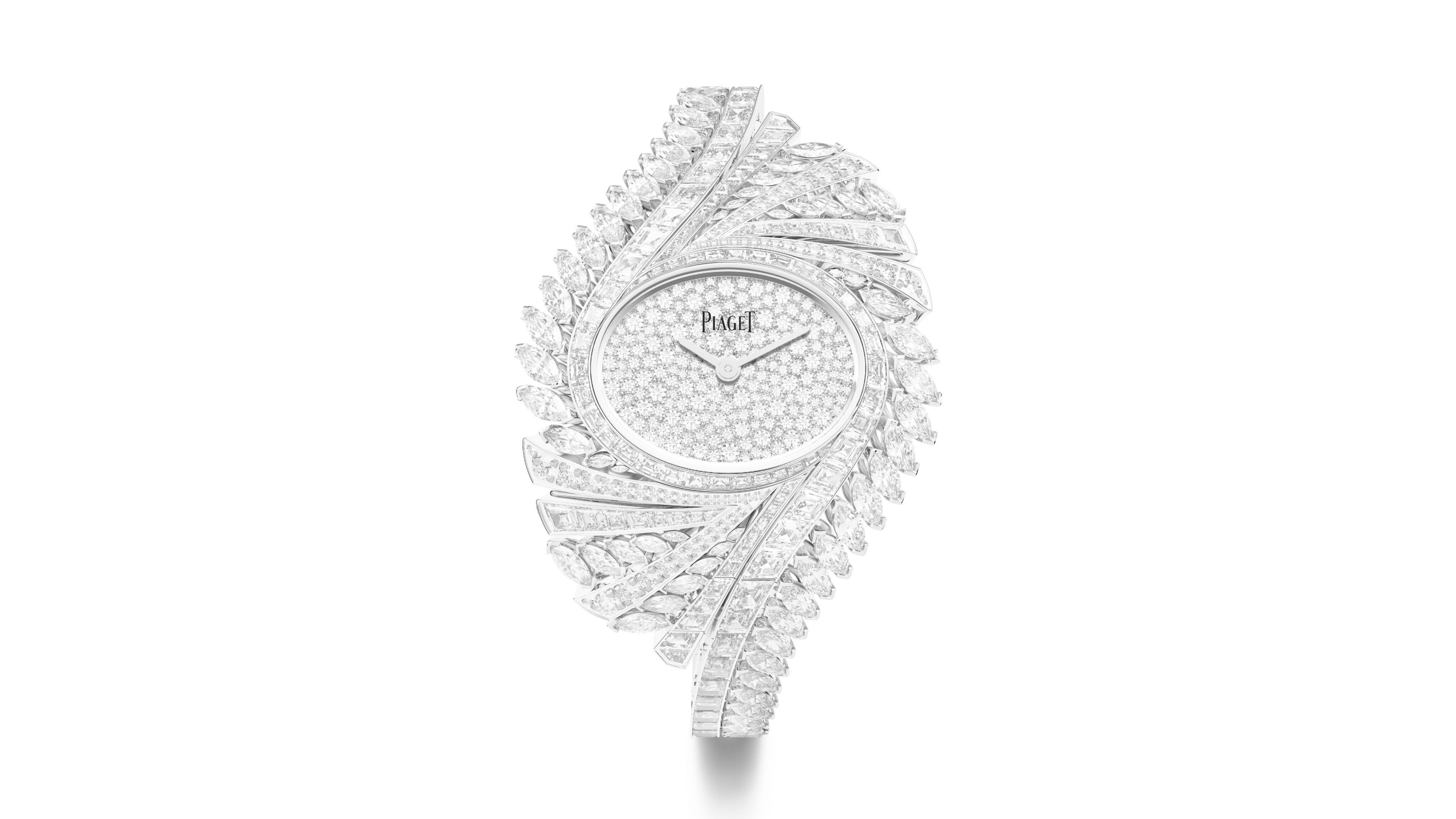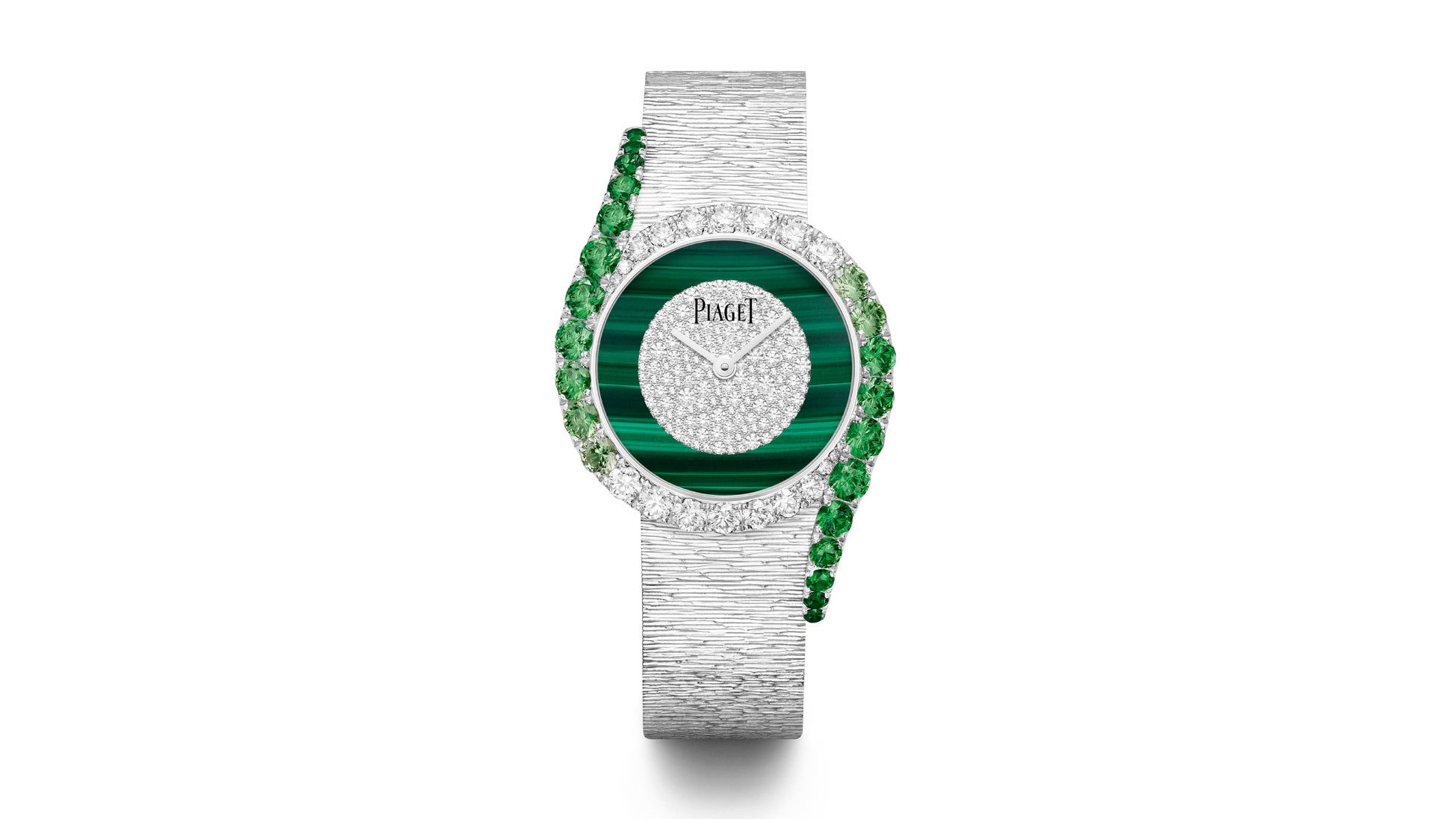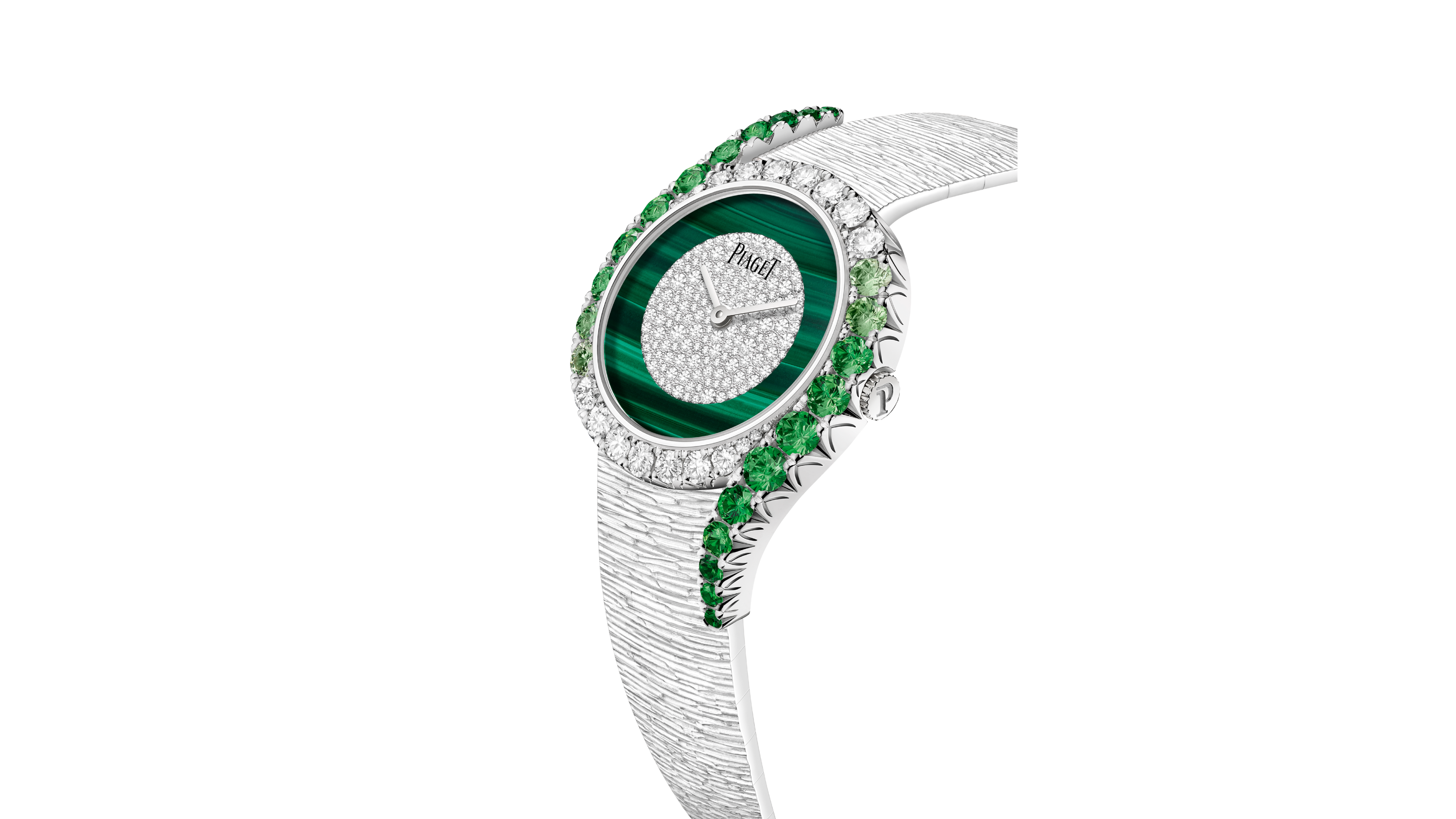 輝き、強さ、躍動感を持ったもう一方の新作は、マラカイトの文字盤を配した中心に、スノーセッティングのパヴェダイヤモンドが輝きます。22個のツァボライトと174個のダイヤモンドがアシンメトリーなベゼルにグラデーションで配されています。ベゼルとラグにはサファイアケースバックからは、ピアジェ自社製自動巻501P1ムーブメントを眺めることが出来ます。このウォッチには、ピアジェのシグネチャーであるパレス装飾が施され、まるでオートクチュールドレスのように繊細で上質な質感を備えています。