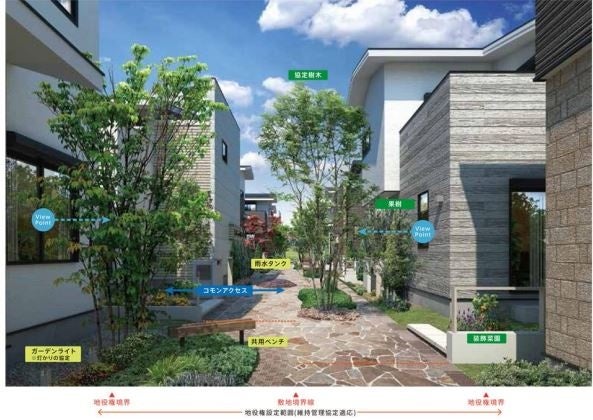 第 1 期から採用している街区構成ダイアグラムの一つで、各戸は背中合わせになる敷地の一部を拠出しあい、 そこを緑豊かな「フットパス」にすることで、通常デッドスペースになりがちな家の裏側をコミュニティの場としています。「フットパス」地中には、電線(太陽光)、通信線を埋設しており、ローコストで無電柱化を実現しました。 「フットパス」は緊急車両を除き車歩分離。各戸の玄関は「フットパス」側に配置されており、適度に顔を合わせる仕組みともなっています。暗くなると、自動で各戸の門灯やガーデンライトが点灯する「灯かりのいえなみ協定」も 締結しています。