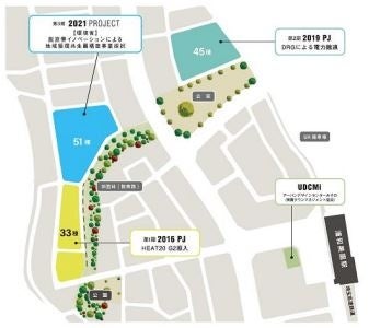 環境省の実証実験として、イオンモール浦和美園内の太陽光発電と分譲地内の 5 棟に設置される太陽光発電と蓄電池、浦和美園のイオン系コンビニ 5 店との間で電力の融通実証を行う。
