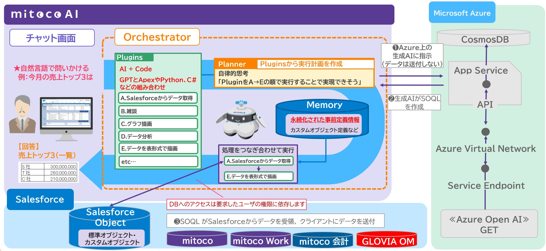 「mitoco AI」は指示を受けると、回答に必要なデータをどのようにオブジェクトから取得すべきかを判断し、その実行計画をMicrosoft Azure上の生成AIに依頼します。OpenAIは実行計画に沿ってデータを取得するためのSOQL(Salesforce Object Query Language)を発行、「mitoco AI」はそのSOQLを実行してSalesforceのオブジェクトからデータを取得し、適切な回答をユーザーに返します。