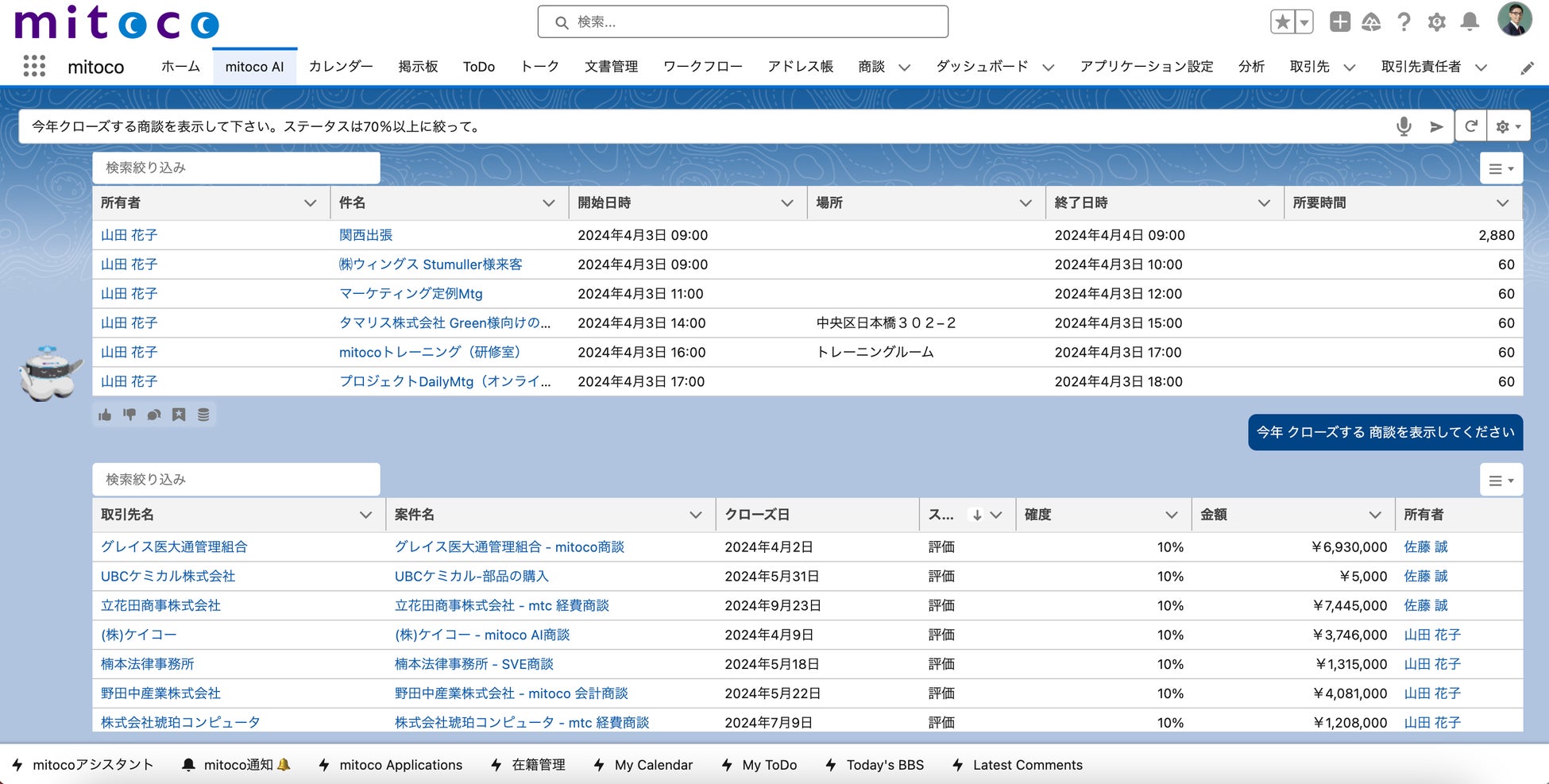 「mitoco AI」はSalesforceに格納されたデータを検索・集計する機能を持つ人工知能です。