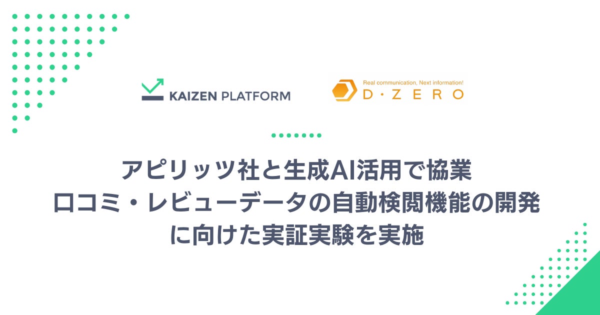 株式会社Kaizen Platform(本社:東京都港区、代表取締役:須藤 憲司、以下「Kaizen Platform」)とグループ会社の株式会社ディーゼロ(以下「ディーゼロ」)は、株式会社アピリッツ(本社:東京都渋谷区、代表取締役社長執行役員CEO:和田順児、以下「アピリッツ」)と協業し、Webサイトに投稿された口コミ・レビューデータへの生成AIを活用した「自動検閲機能」を開発し、実証実験を実施しました。