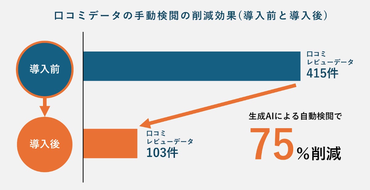 結果として、集められた415件の口コミデータのうち、生成AIを活用した自動検閲で約75%の削減効果を達成し、手動検閲の数を103件まで減らす成果を実現しました。