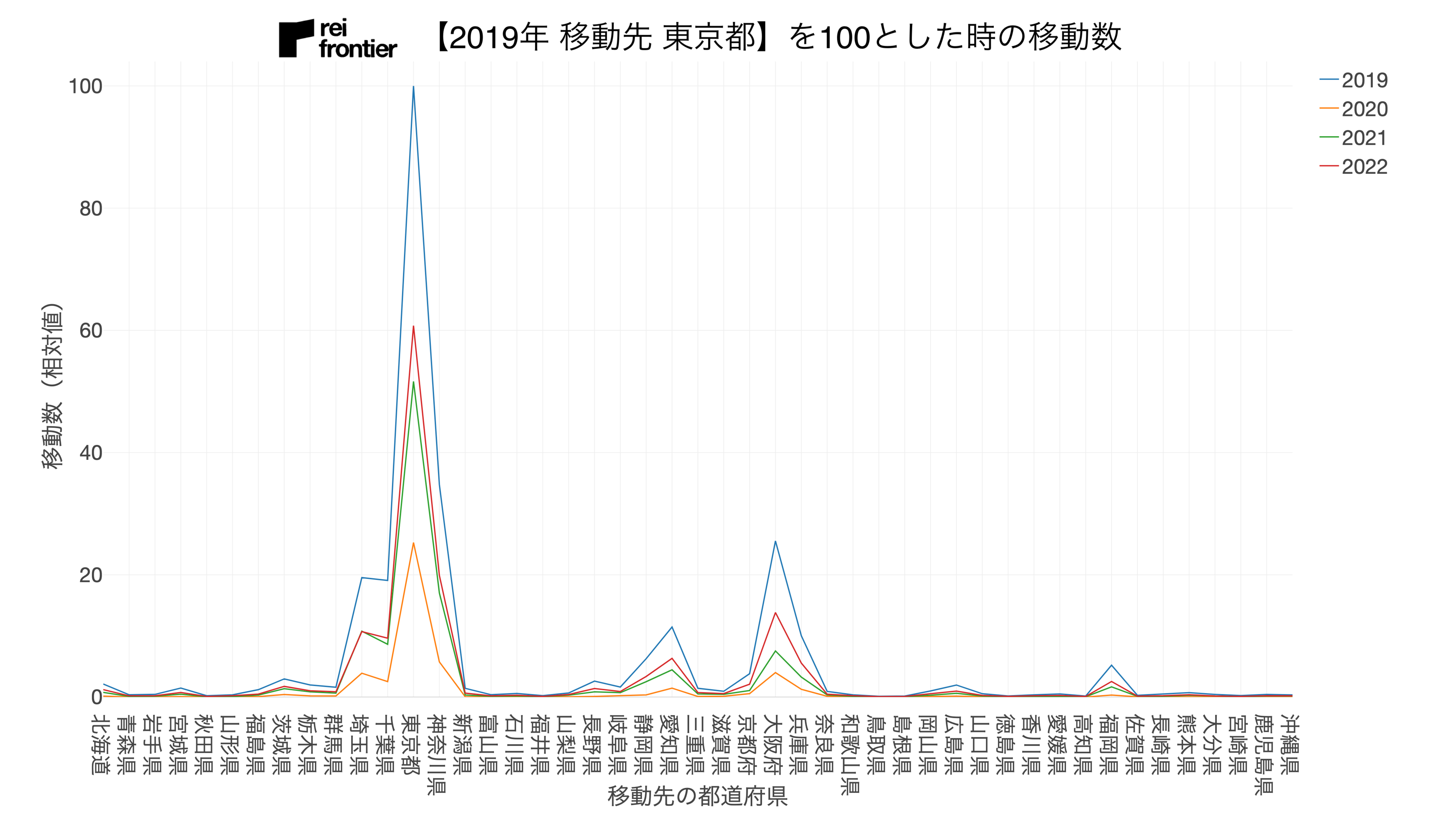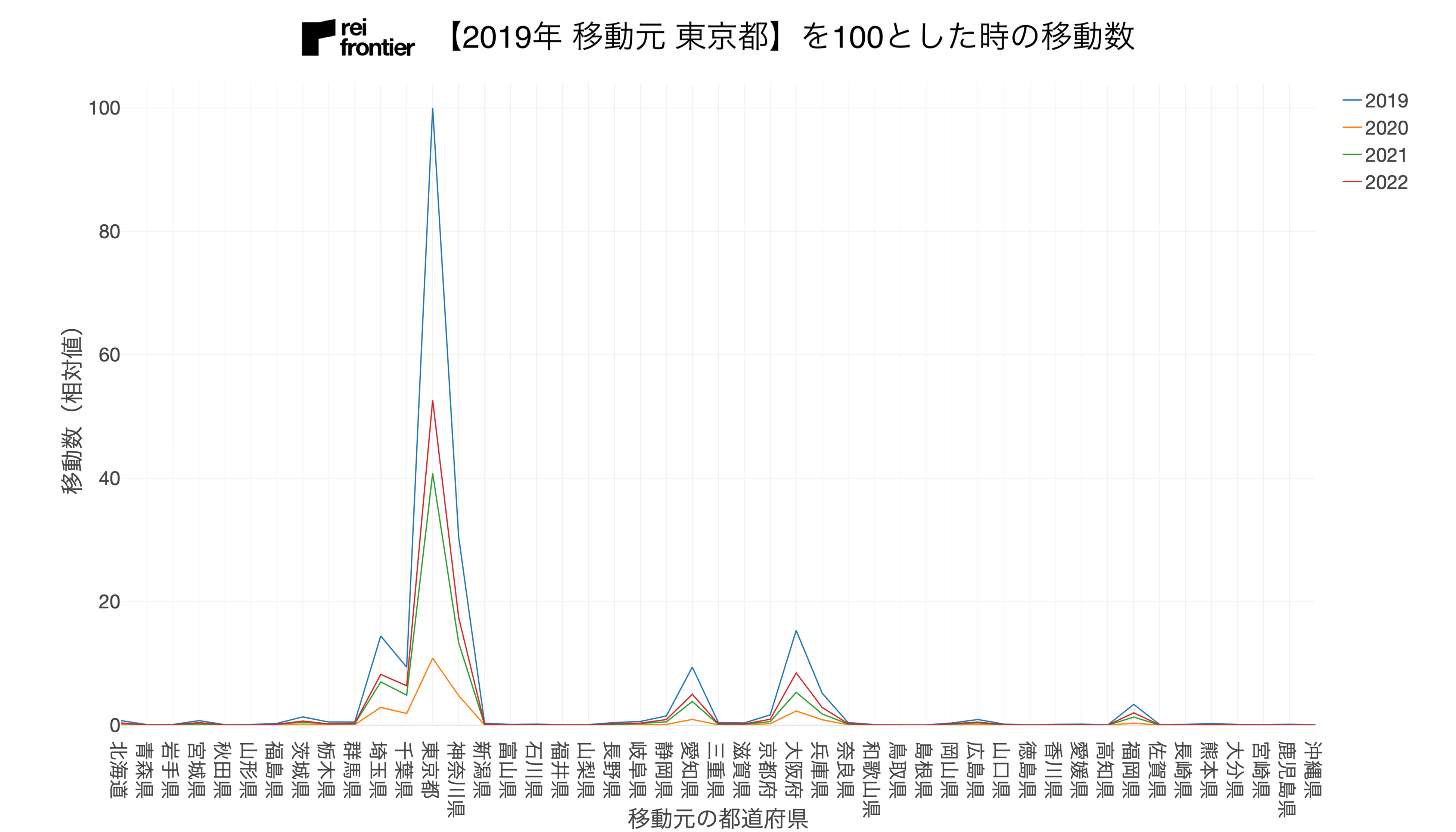 こちらは2019年から2022年までの4年分のデータで、「2019年の移動先が東京都」を100とした時の、移動先別の他県への移動数を表しています。