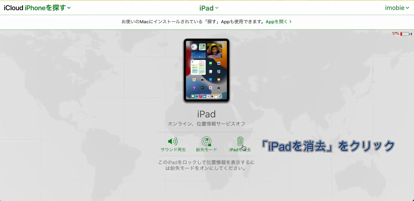 www.icloud.com/findにアクセス、iCloud IDをサインインし、初期化したい端末を選択し「情報」の画面から「消去」を実行します。