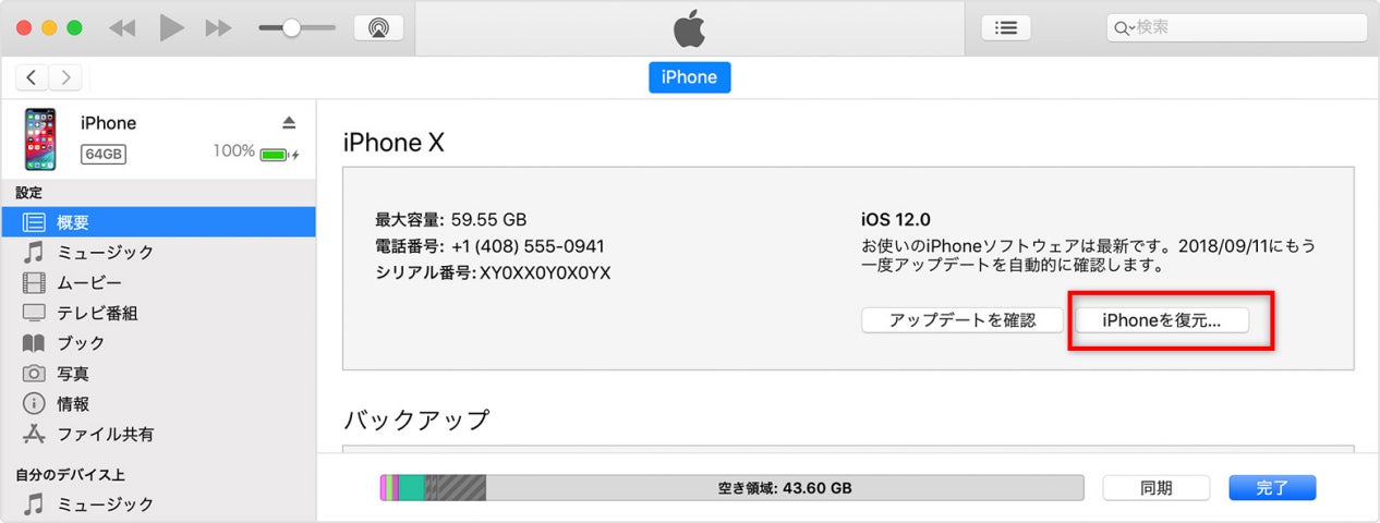 5.「概要」パネルから「iPhoneを復元」をクリックします。
