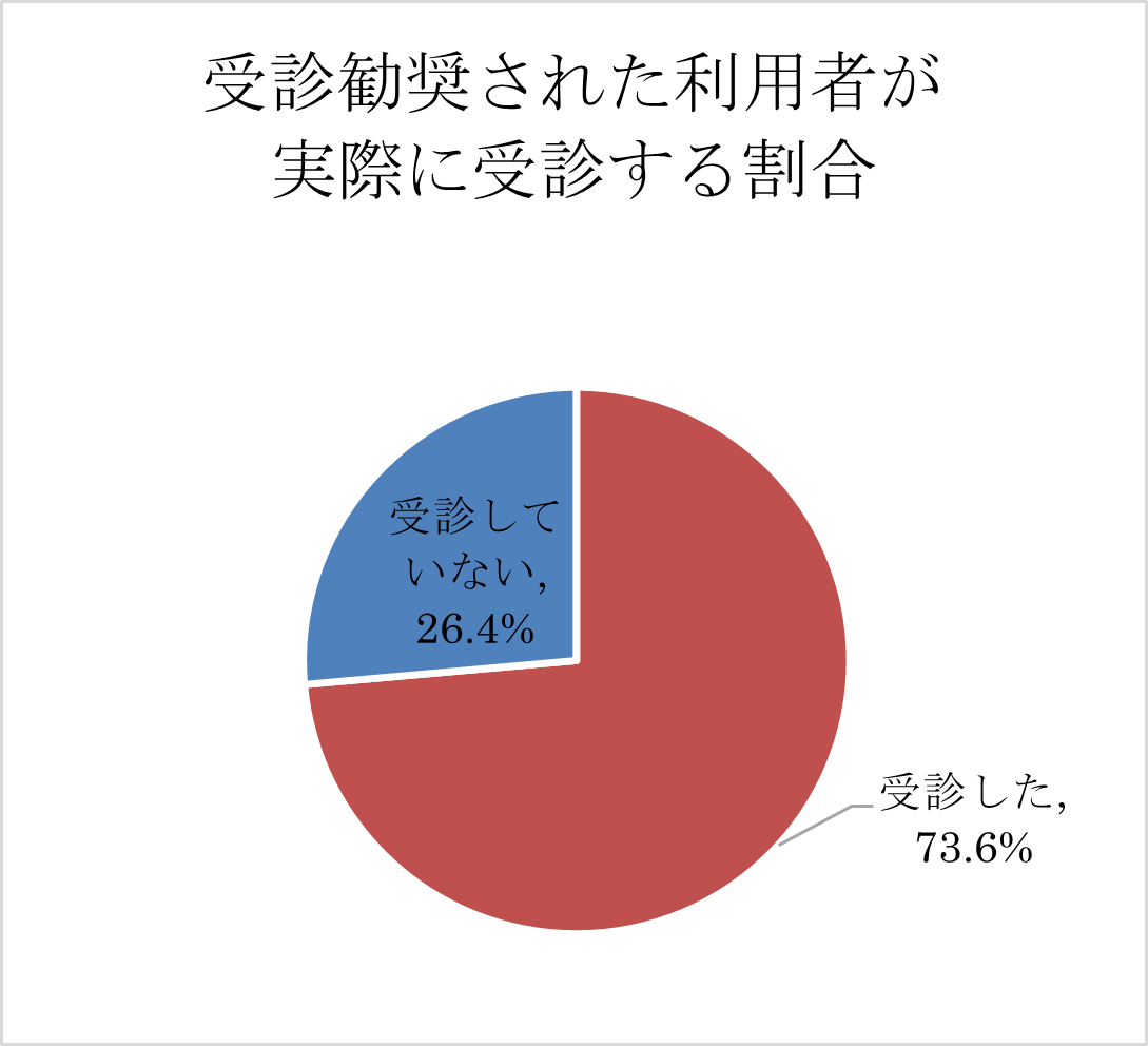 ケアマネジャーが受診勧奨した利用者のうち、73.6%もの方が実際に皮膚科を受診していました。