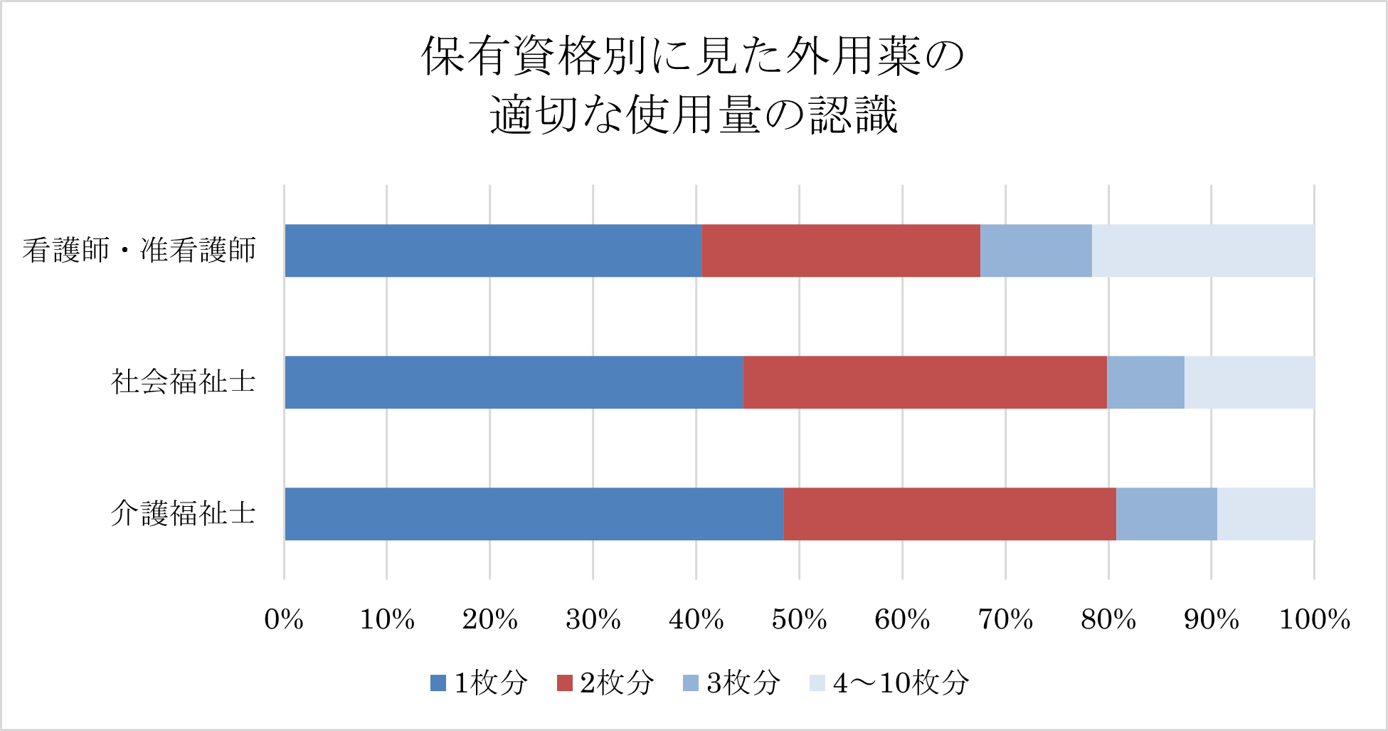 使用量についての認識を保有資格別に見たところ、正解率が低かったのは「看護師・准看護師」で、塗る量が面積に対して少ない傾向にありました。