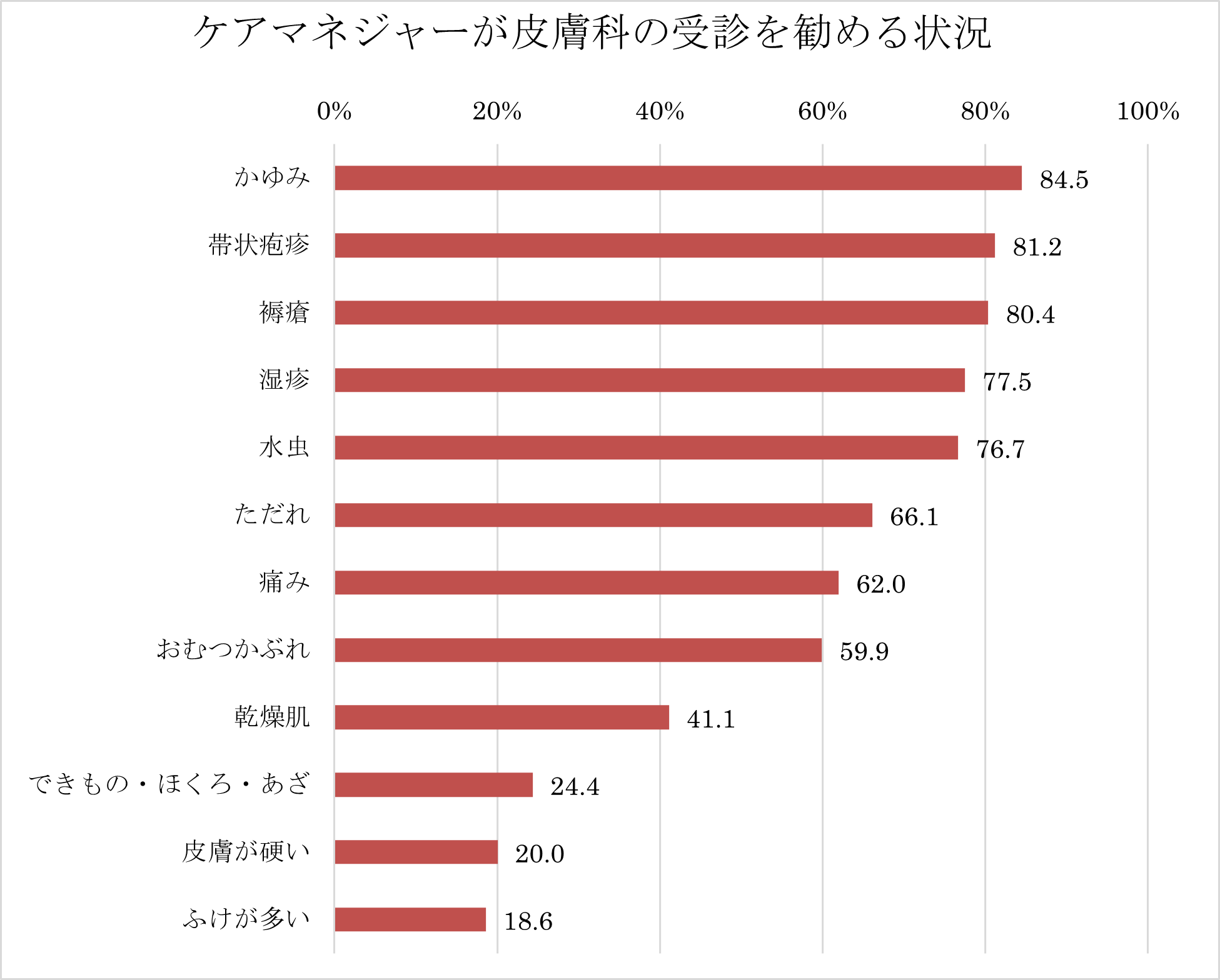 受診を勧めるケアマネジャーが最も多かったのは「かゆみ(84.5%)」、次いで「帯状疱疹(81.2%)」、「褥瘡(80.4%)」でした。