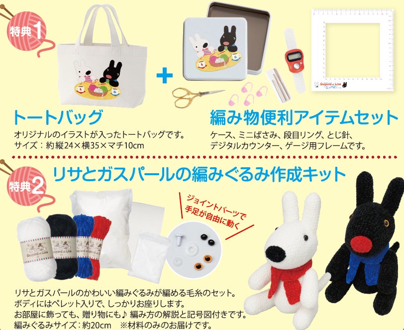 さらに、定期購読をお申し込みの方全員に「オリジナルトートバッグ」、「編み物便利セット」やボディにペレットが入っていてしっかりとお座りする「リサとガスパールの編みぐるみ作成キット」をプレゼント。