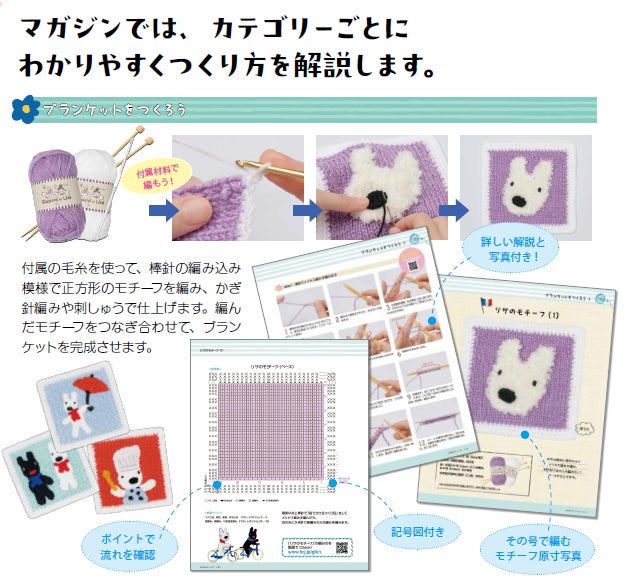 必要な材料、写真や動画で基本の編み方やモチーフの編み方のくわしい解説が付いている『リサとガスパールのニット&クロシェ』は、編み物ブームをきっかけに手芸に初挑戦したい方でもすぐに始められるのがうれしいポイント!