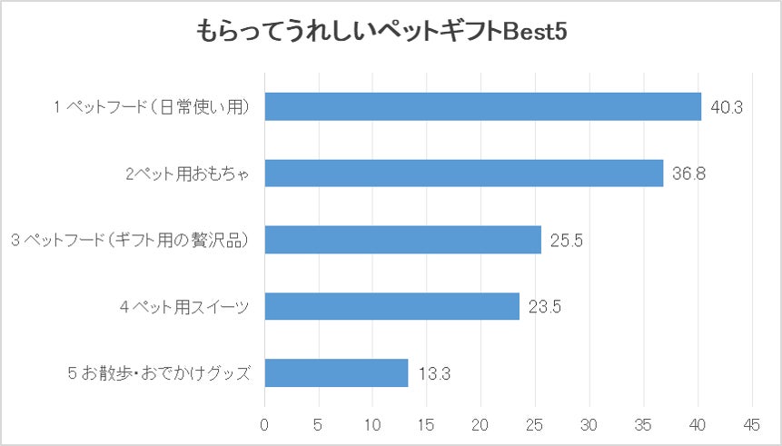 ペットギフトを贈ったことがある方に、何を贈ったかと聞いたところ、1位は「ペット用おもちゃ」、2位「ペットフード(日常使い用)」、3位「ペット用スイーツ」、4位「ペットフード(ギフト用の贅沢品)」、5位「洋服」という結果でした。