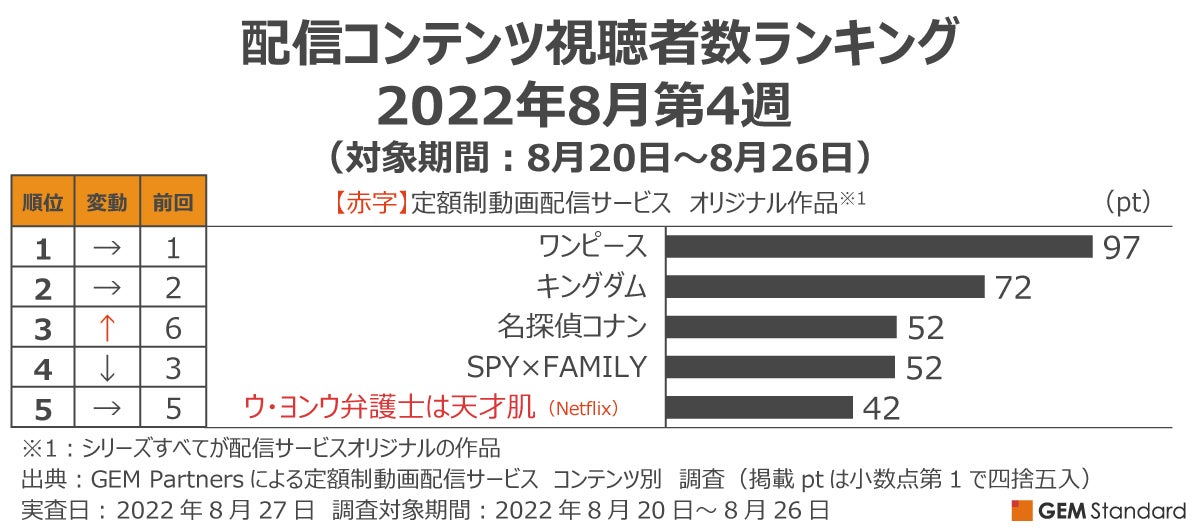 エンタテイメント業界に向けたデータ×デジタルマーケティングサービスを提供するGEM Partners株式会社(ジェムパートナーズ、所在地:東京都港区、代表取締役:梅津文)は9月1日(木)、複数の定額制動画配信サービスを横断して集計した2022年8月第4週の「配信サービス視聴者数ランキング(調査対象期間:8月20日~8月26日、調査対象:日本在住15~69歳男女)」を発表します。