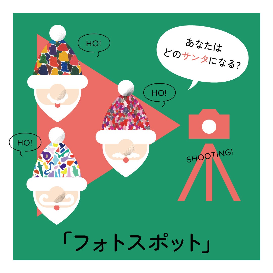 見かけたらついついやりたくなってしまう!?顔はめパネルのフォトスポットが登場!キービジュアルに使用しているサンタさん7人が描かれているパネルの顔部分に自分の顔をはめて写真を撮っていただけます。