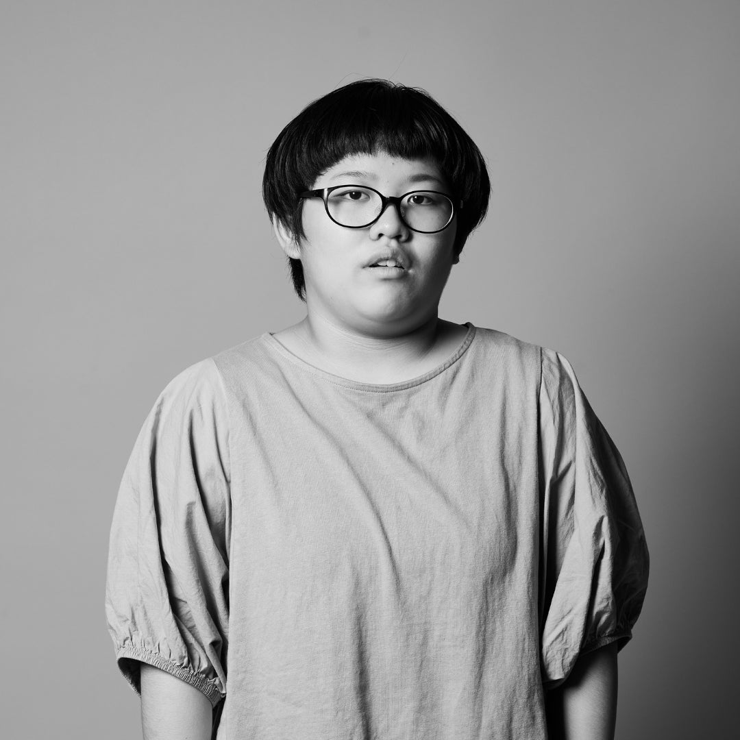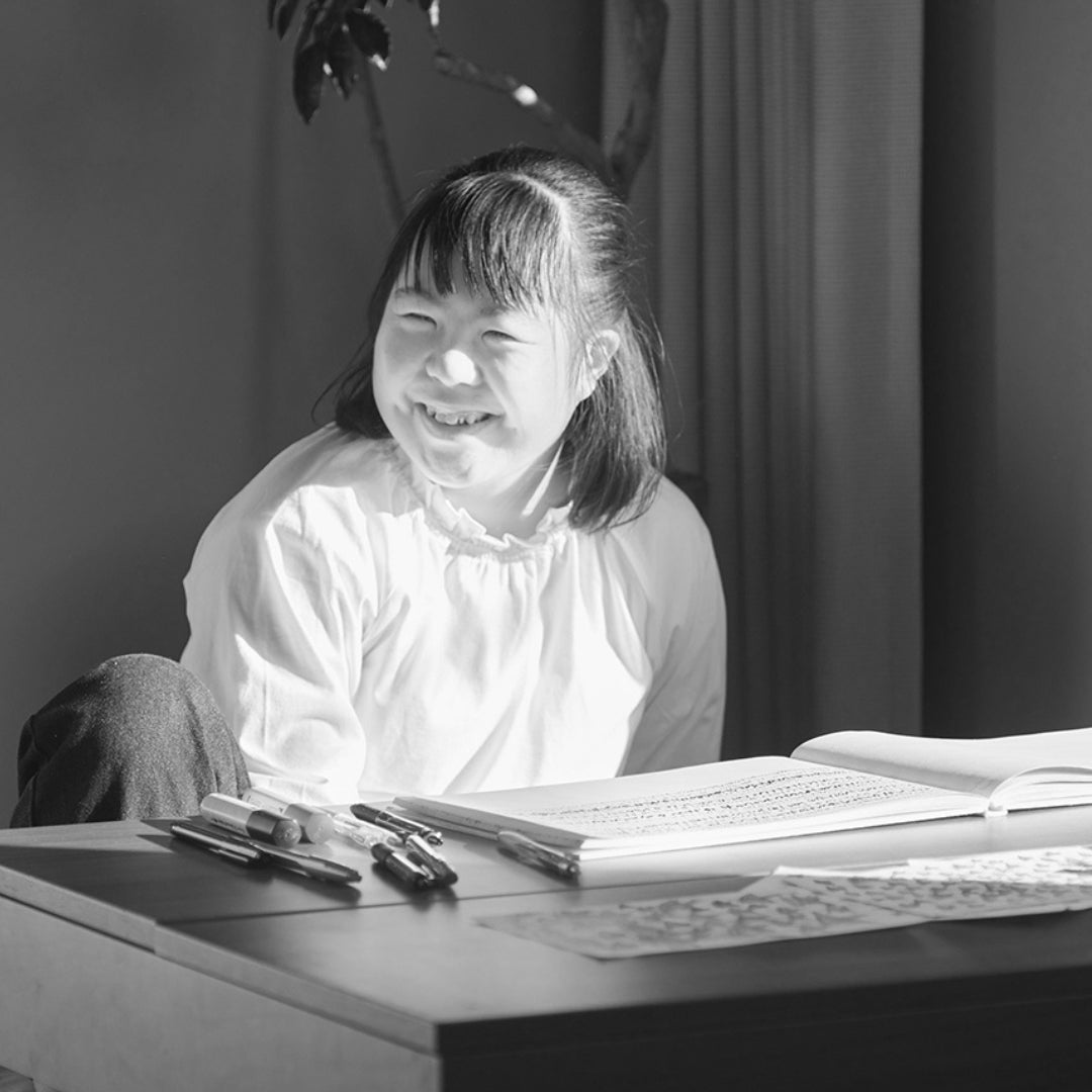 東京都内特別支援学校在学中。お寿司とゲーム(マリオカート)と、お料理すること、絵を描くことが大好き。シール、スタンプ、ドリッピングなど様々な絵作りをするなか、一番気に入っているものは、古代なのか宇宙なのか未来の言語なのか、彼女なりのタイポグラフィを ノート一面に書き綴っているものである。