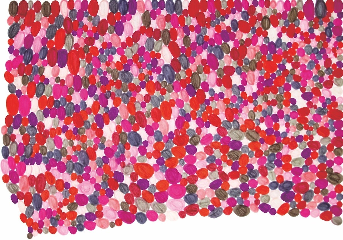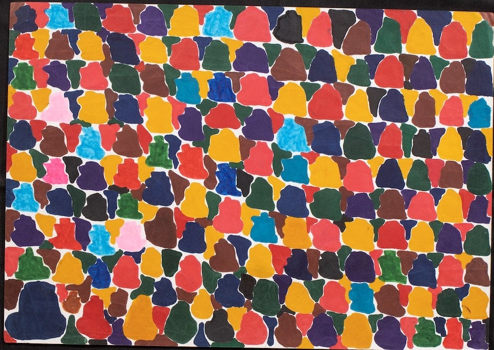 彼の文字への執着は幼少の頃から続いている。自室で密かに制作していた作品が紹介されると、たちまち国内外から注目を集める。画用紙を最後まで埋め尽くした作品は数枚しかなく、大半は途中でとまっていて、なぜか縦方向に描き進んでいる。作品の評価や世間の注目とは無縁に、10年ほど前から漢字ではなく、色とりどりのベルや星、そして近年は小さなドットを描くことに熱中している。まるで染め物のように裏面に滲み出るまで執拗に塗り込み、その行為自体を楽しんでいるかのよう。執念的と言える彼のこだわりと手法に思わず感嘆する。