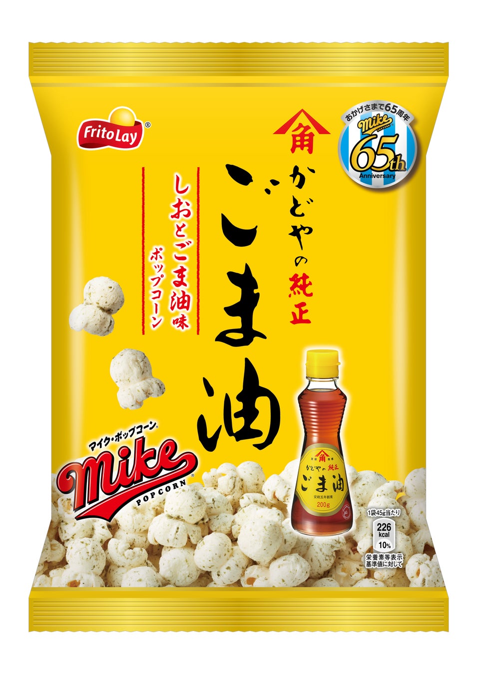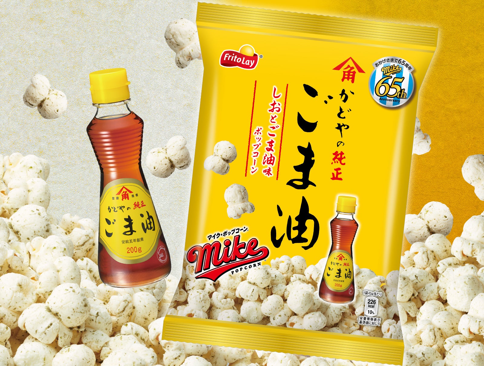 2018年6月に発売し、そのやみつきになる味わいから話題となった『マイクポップコーン しおとごま油味』が復活します。本商品は、2022年で発売65周年を迎える「マイクポップコーン」と、発売55周年を迎えるかどや製油株式会社の「純正ごま油」との、ロングセラー同士の周年コラボレーション商品です。