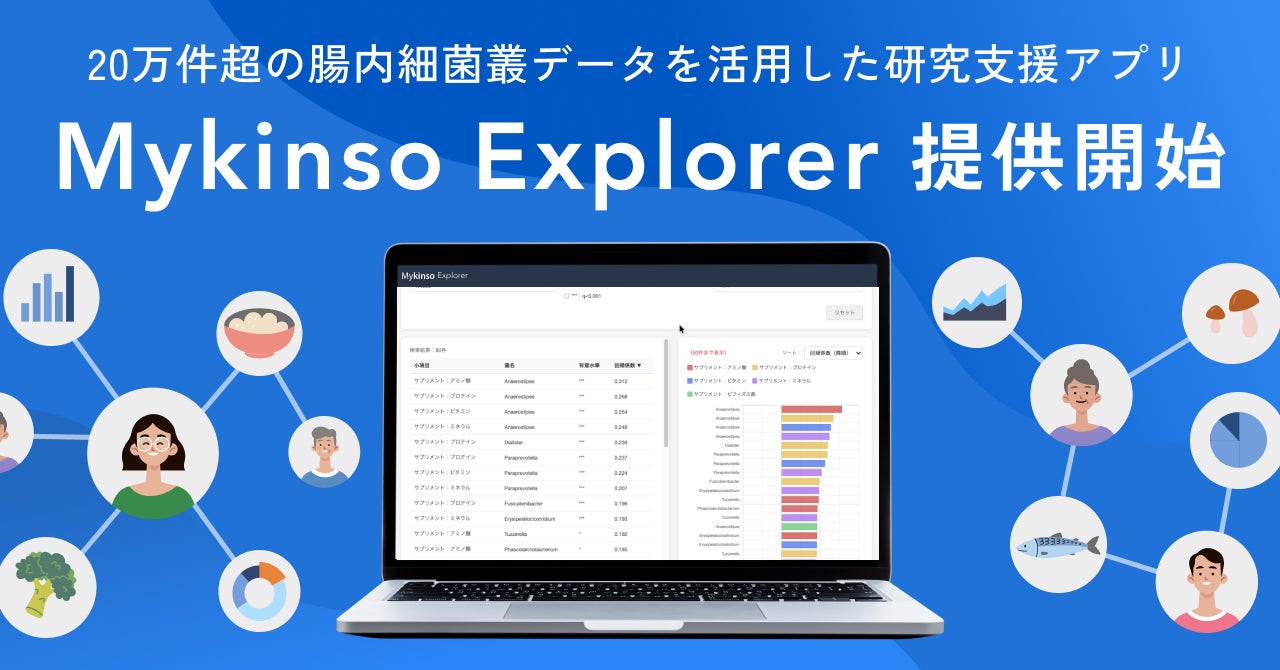 株式会社サイキンソー(本社:東京都渋谷区、代表取締役:原 洋介、以下サイキンソー)は、累計20万件以上の腸内細菌叢データを基盤としたデータアプリケーション「Mykinso Explorer(マイキンソーエクスプローラー)」を2026年4月6日より提供開始いたします。