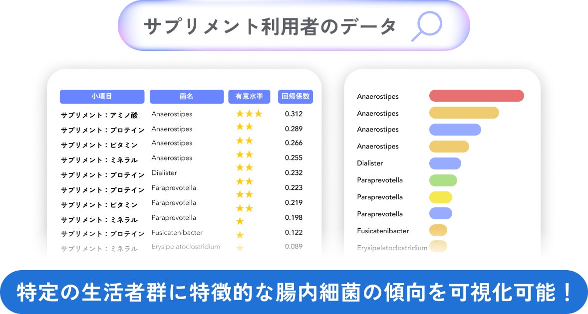 本サービスの活用により、食品・飲料・サプリメントメーカーなどの研究開発及びマーケティング担当者は、生活者データと腸内細菌データを横断的に分析し、仮説探索から検証設計までをワンストップで実施可能になります。