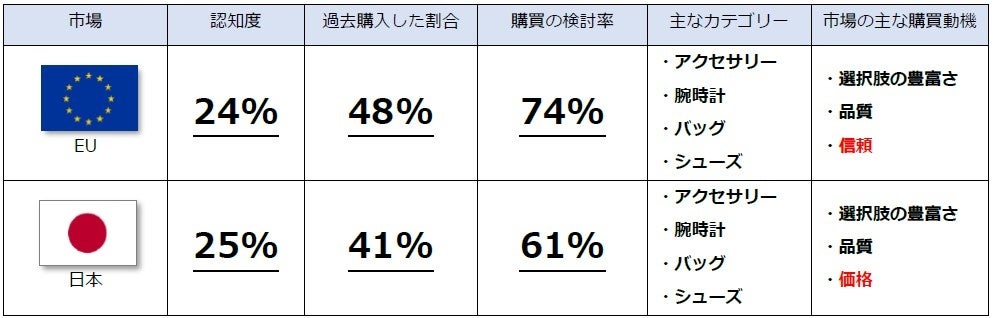 eBayの調査(※1)によると、越境EC取引の利点は、より最適な価格で購入できることですが、品質や信頼性も重要視され、特に、偽物への懸念、送料や返品ポリシーへの不安などが購入の障壁となっています。ここで市場別の選択基準を見ると、ヨーロッパは「信頼」、アジアは「価格」が重視されています。日本は厳格な偽造品対策により信頼を得ており、越境EC取引における購買期待度もヨーロッパ並みに高いのですが、中国や一部の南アジア市場への不信感から、越境EC購入者は依然ヨーロッパ市場を好む傾向にあります。日本がさらなる信頼を獲得するためにも、真贋保証を強化し、購入者の不安を解消する必要があります。
