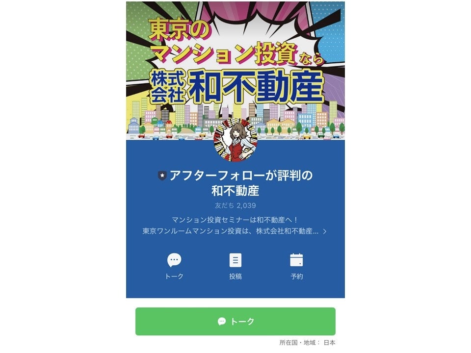 和不動産LINE公式アカウントとお友だちになり、不動産投資の収益アップのプロである和不動産を、不動産投資成功のためのナビゲーターにしませんか?(※返信の際にお名前等の個人情報をお伺いさせていただく場合があります)