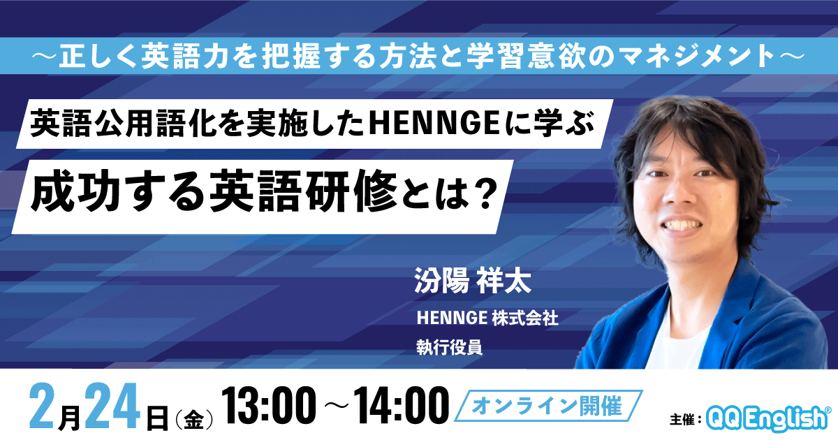 本セミナーでは、英語公用語化に成功し、優秀な外国人エンジニアの採用をされているHENNGE株式会社の執行役員 汾陽 翔太氏をお招きし、成功する社員の英語研修のコツや、英語力を測定する方法・学習意欲のマネジメントについてお話し頂きます。