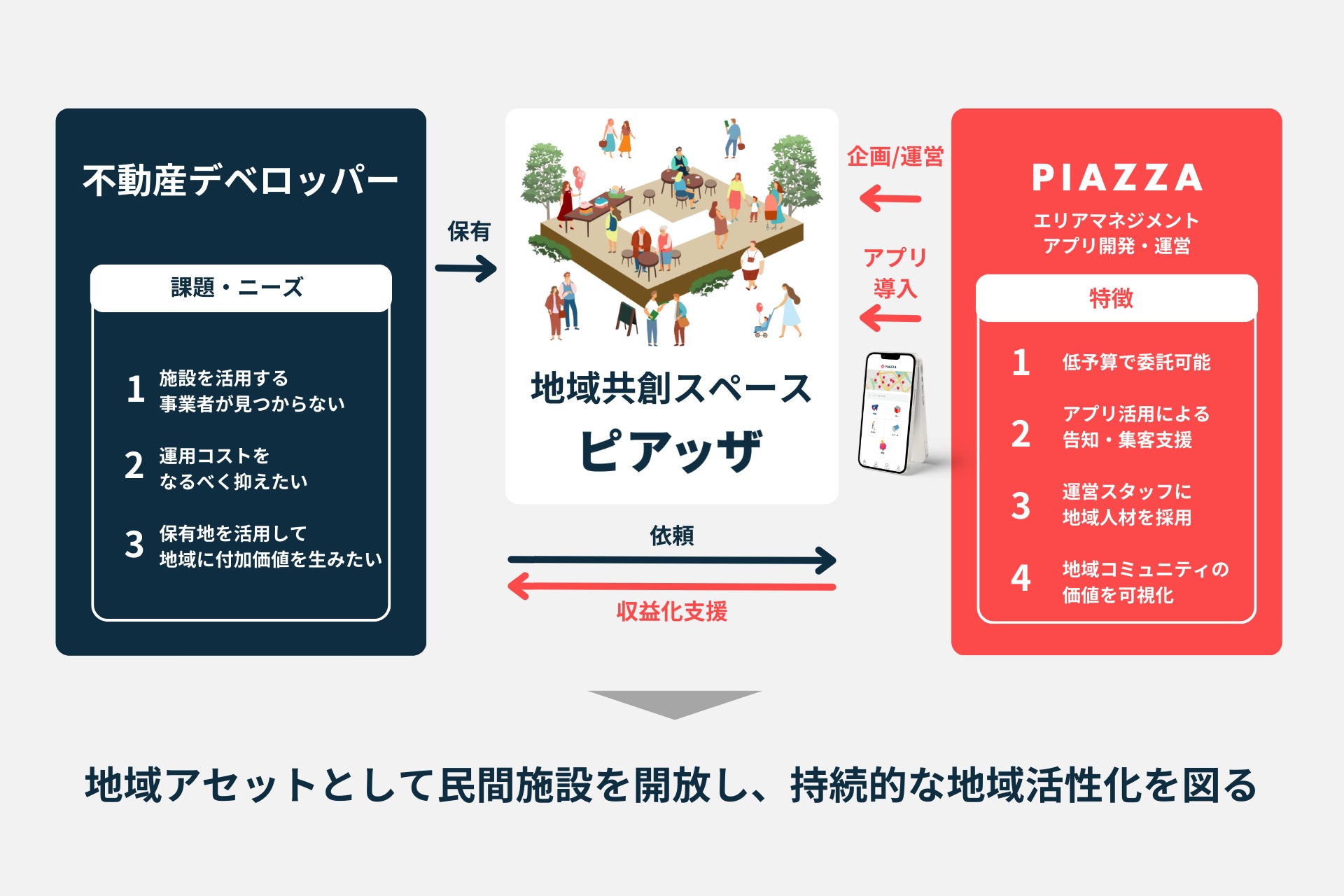 地域コミュニティアプリ「ピアッザ」を運営するPIAZZA株式会社(本社:東京都中央区、代表取締役 CEO:矢野 晃平)は、エリアマネジメントにおける人材・財源不足を解消し持続可能な地域活性化を図るため、地域共創スペース「ピアッザ」の企画・プロデュースおよび運営を本格始動します。