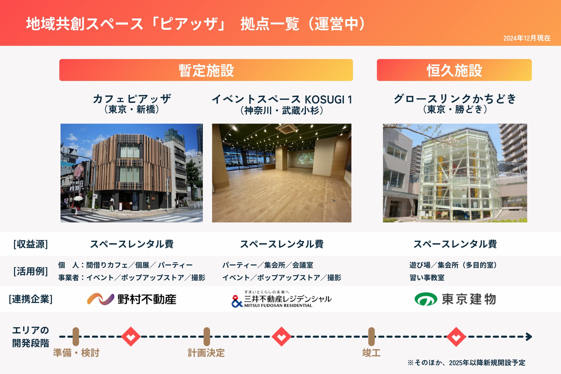 現在運営中の3施設を含めて、PIAZZAはこれまでに5つの地域共創スペースの企画・運営を担ってきました。2025年以降も、新たに複数拠点の開設を予定しています。