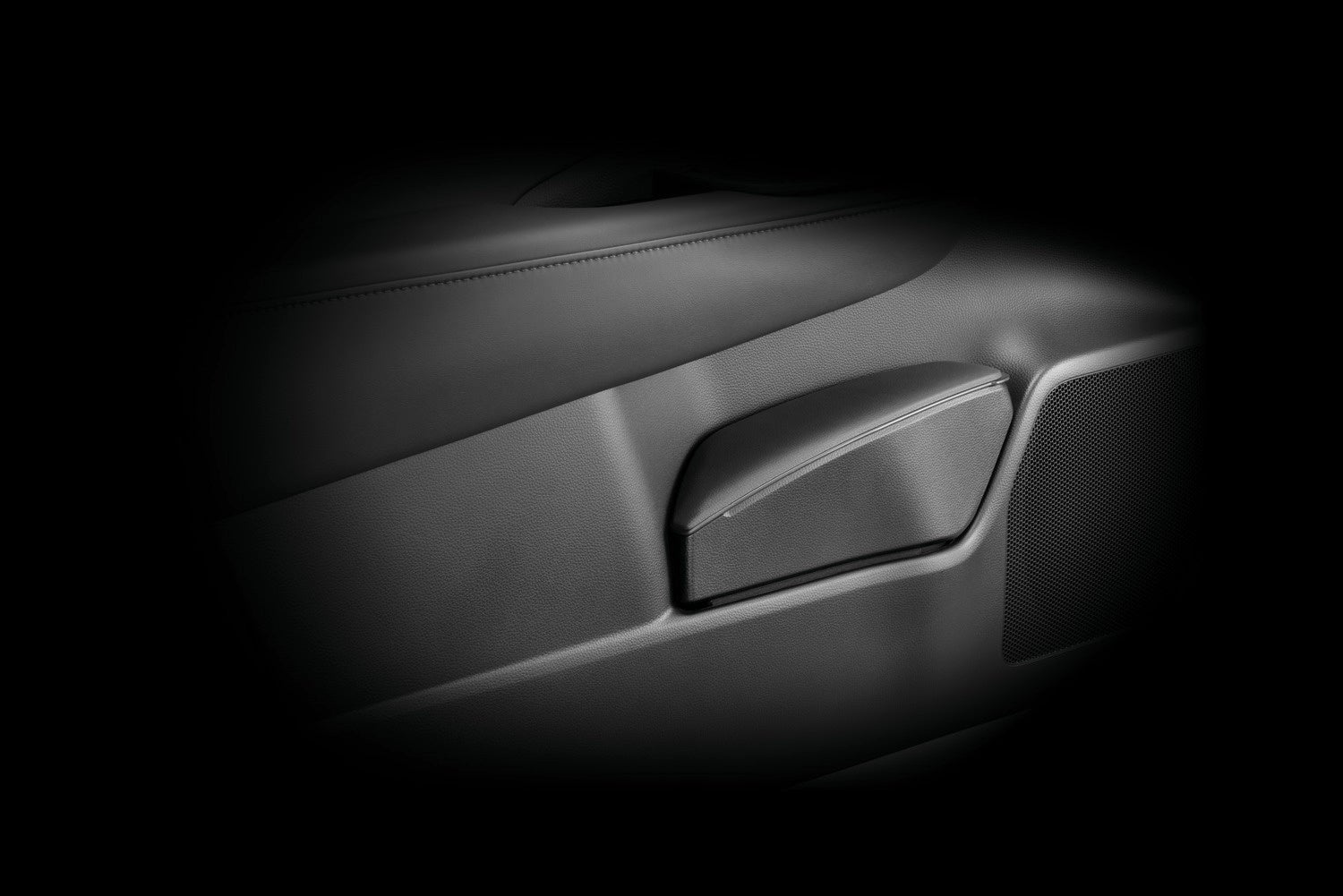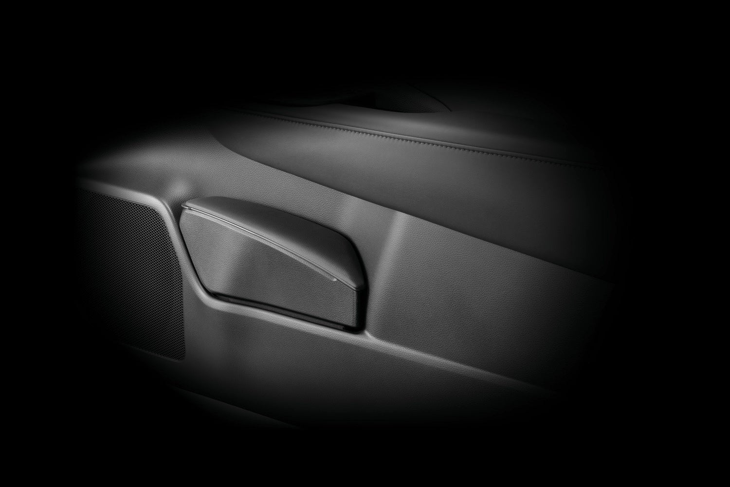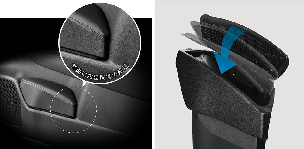 内装色と同じ色になるよう調色した樹脂を使用。内装と一体になるよう革シボの表面処理を施しました。(下画像:左)