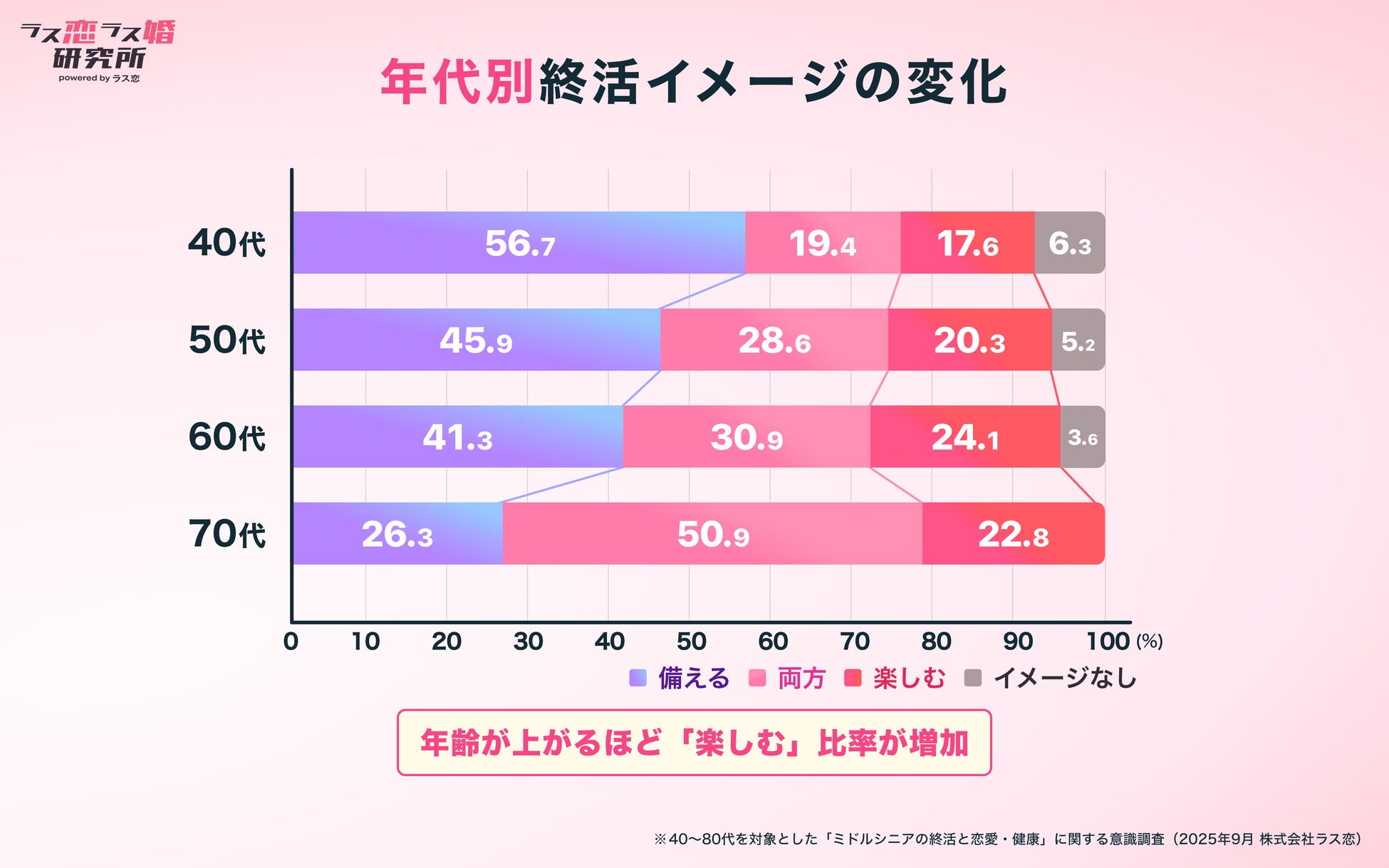 株式会社ラス恋(アイザックグループ/本社:東京都渋谷区/代表取締役CEO:山口 昂星)が運営する、対象年齢が40歳以上の恋活・婚活マッチングアプリ「ラス恋」は、2025年9月、40〜80代の「ラス恋」ユーザー1,926名を対象に「終活と恋愛・健康」に関する意識調査を実施しました。