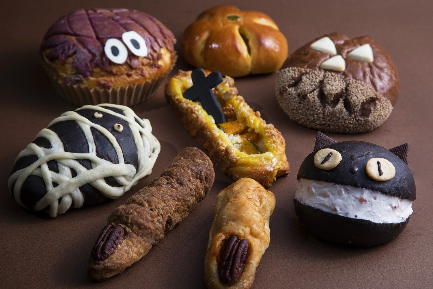 カボチャや栗、紅芋など、秋の味覚を使ったハロウィンパン大集合!魔女の指のようなピスタチオクリームパン、黒猫のマリトッツォ、クリームチーズにカボチャの漬物が入ったミイラパン、和栗のパンなど、見た目も味も個性的なパンばかり。ぜひご家族でお楽しみください。