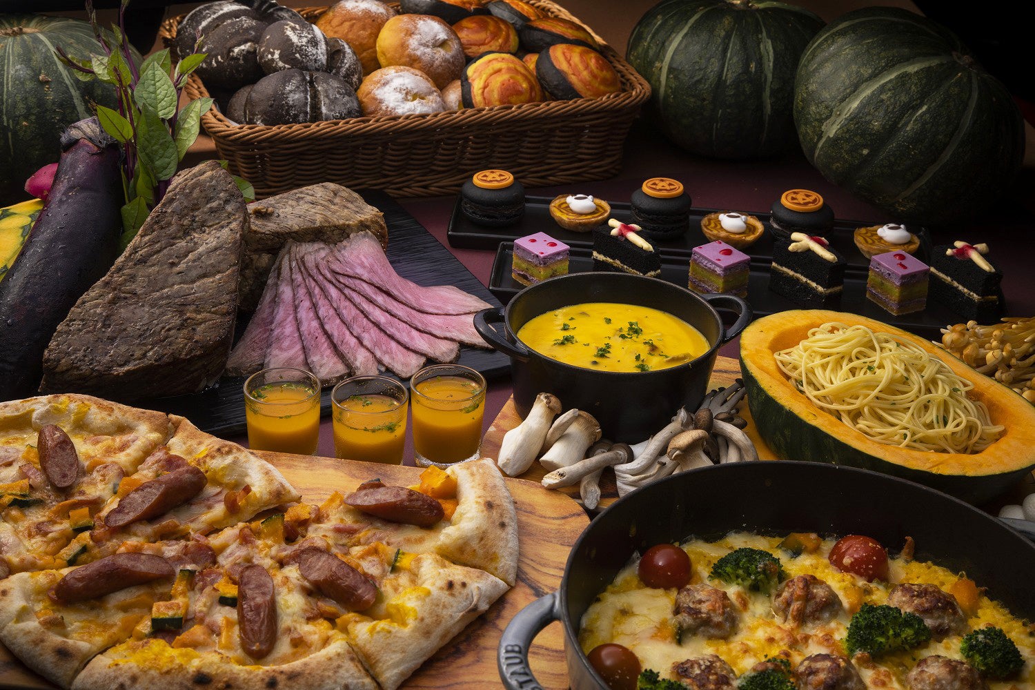 ディナービュッフェに、ジャック・オー・ランタンやお化けなど、上品ながらも遊び心くすぐるハロウィンスイーツが登場!カボチャを使った焼きリゾットやパスタ、ピッツァなど、秋の実りを感じるビュッフェメニューをお楽しみください。