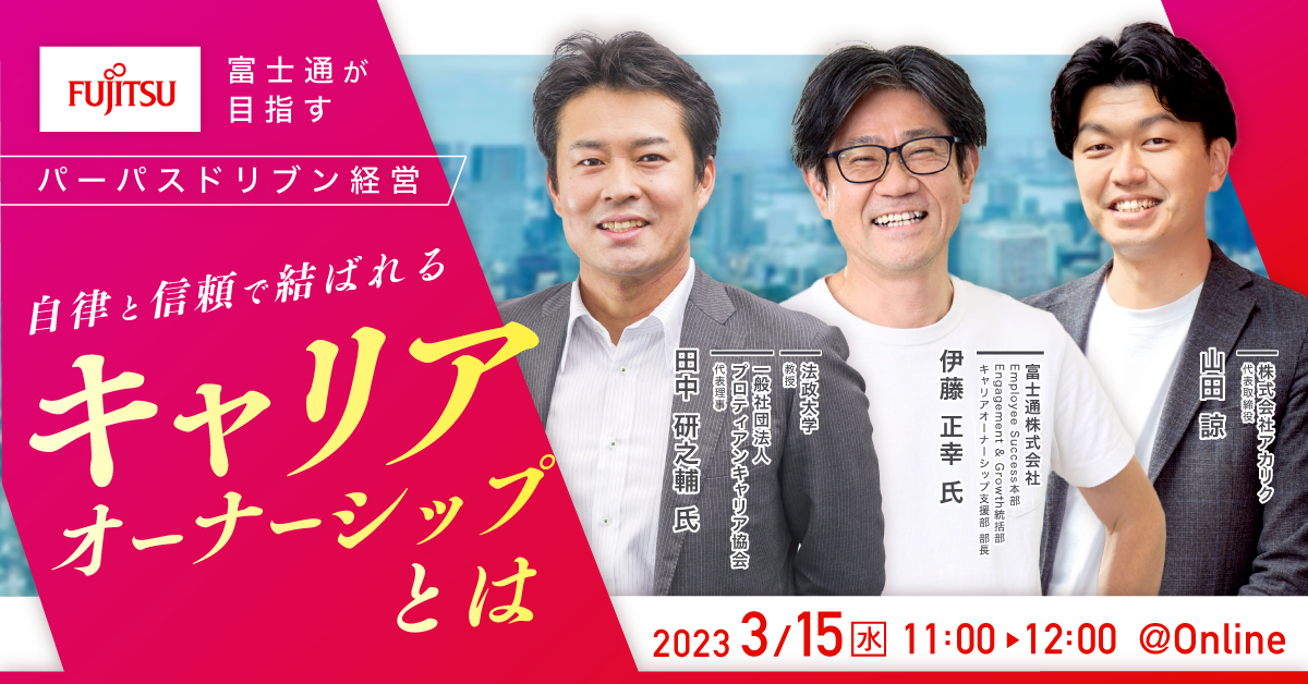 2023年3月15日(水)11:00 - 12:00 @オンライン【富士通株式会社 キャリアオーナーシップ支援部 部長 伊藤氏 × 法政大学キャリアデザイン学部教授 田中氏が登壇】