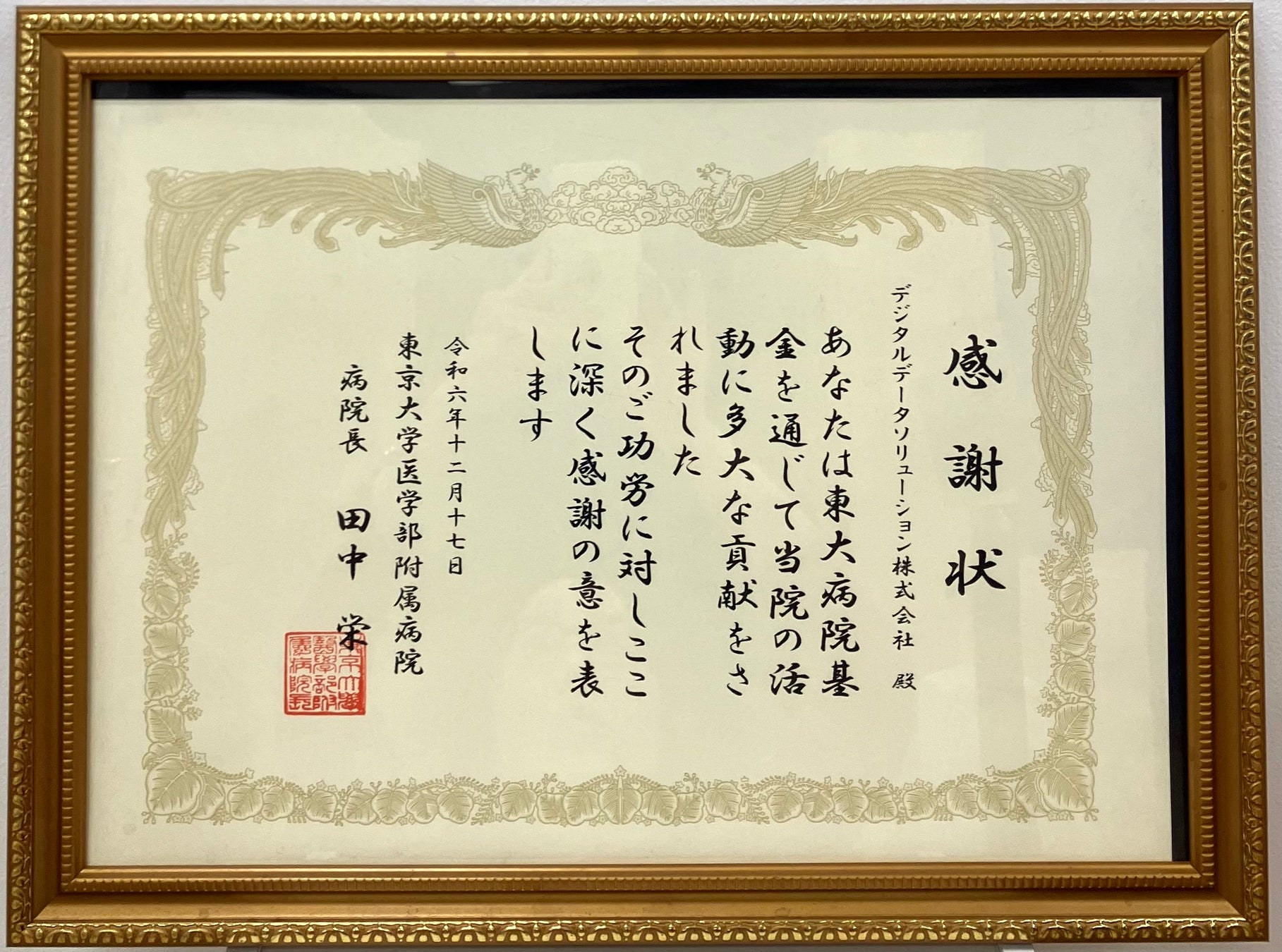 デジタルデータソリューション株式会社(本社:東京都港区、代表取締役社長:熊谷 聖司、以下デジタルデータソリューション)は、医療現場の向上に寄与するため東京大学医学部附属病院に寄付を行ったことをお知らせします。