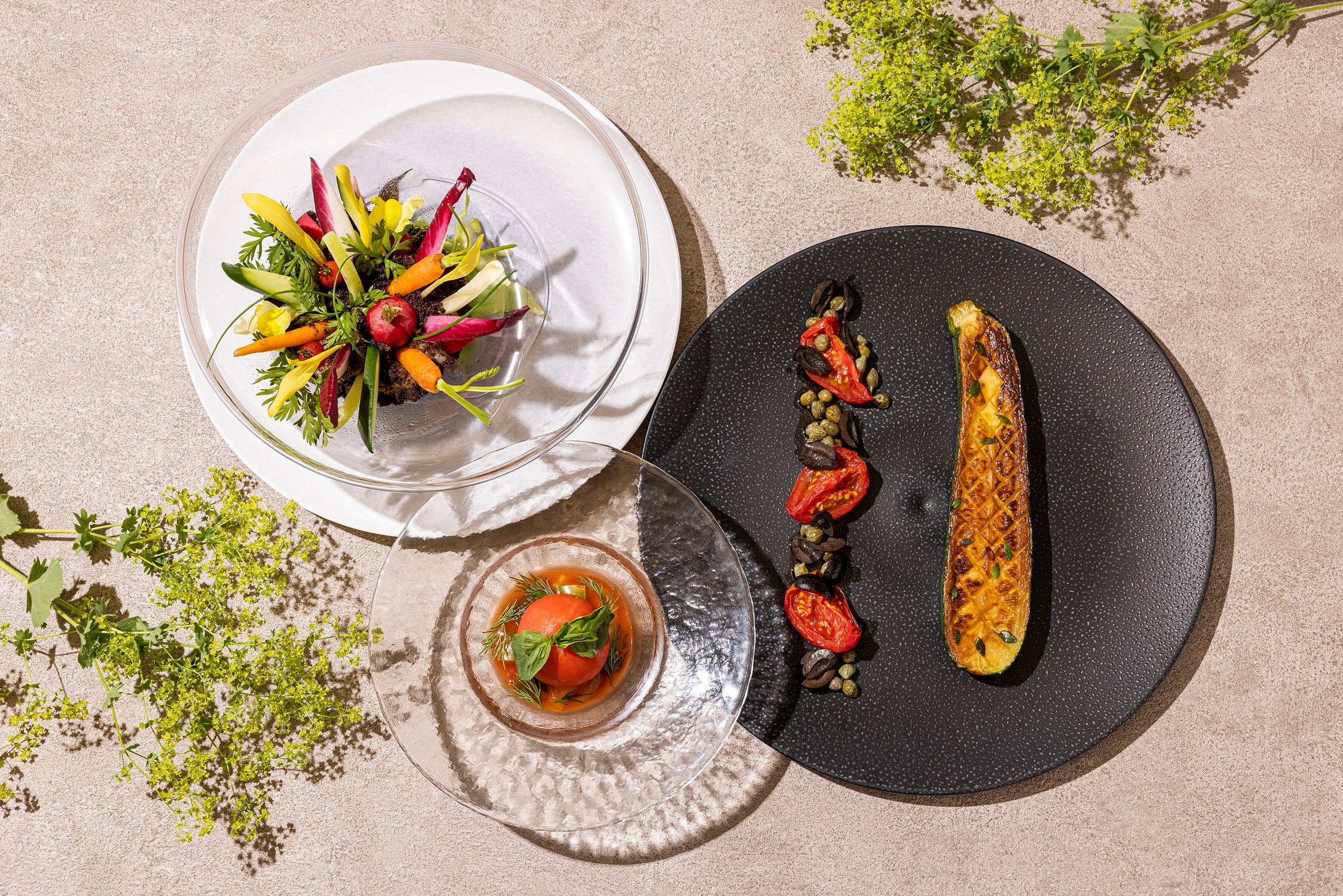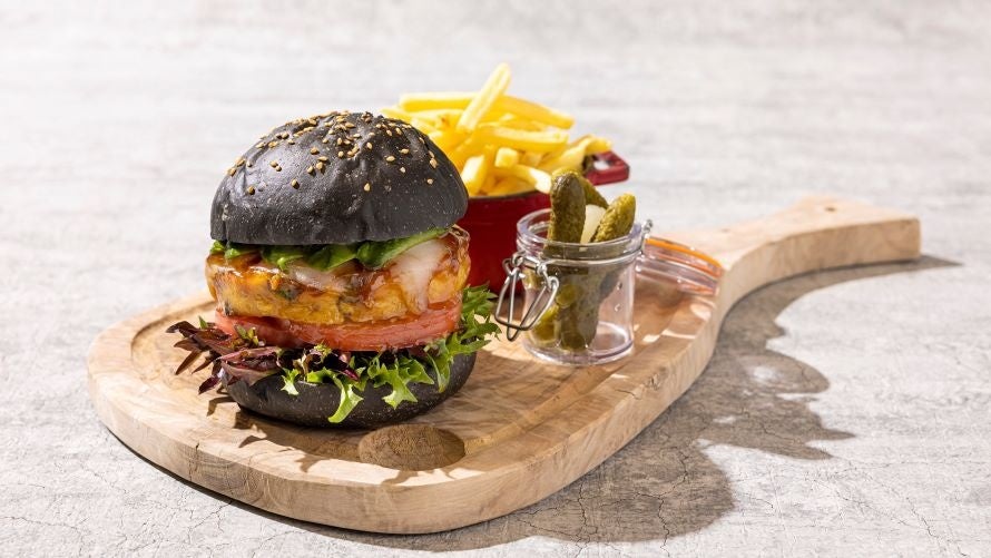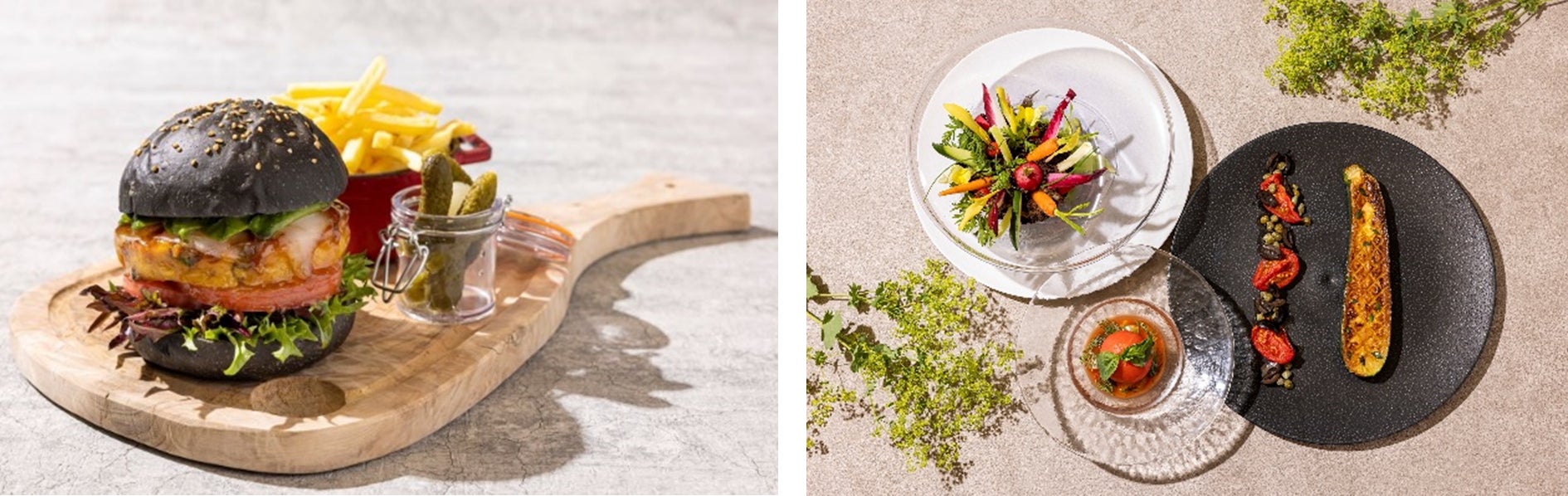 「ザ・プリンスギャラリー 東京紀尾井町」では、インルームダイニングにて「ヴィーガーデンバーガー」を提供。竹炭のバンズにオニオンやキャロット、インゲン、ひよこ豆、干し椎茸で作る焼き豆腐のパティを挟み、チーズの代わりに大豆由来の食材を使用した100%植物由来のハンバーガーです。このハンバーガーはホテル内のレストラン「All-Day Dining OASIS GARDEN」でも提供しており、ここで味わえる人気のヴィーガンディナーコース「NATURE DELIGHT」もおすすめです。
