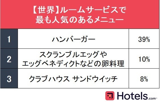 ヴィーガンやベジタリアンメニューの注文が増加している一方で、ルームサービスで最も人気のあるメニューについて、世界で最も多かった回答は「ハンバーガー(39%)」。日本でも、36%が「ハンバーガー」と回答し、最も多い回答となりました。