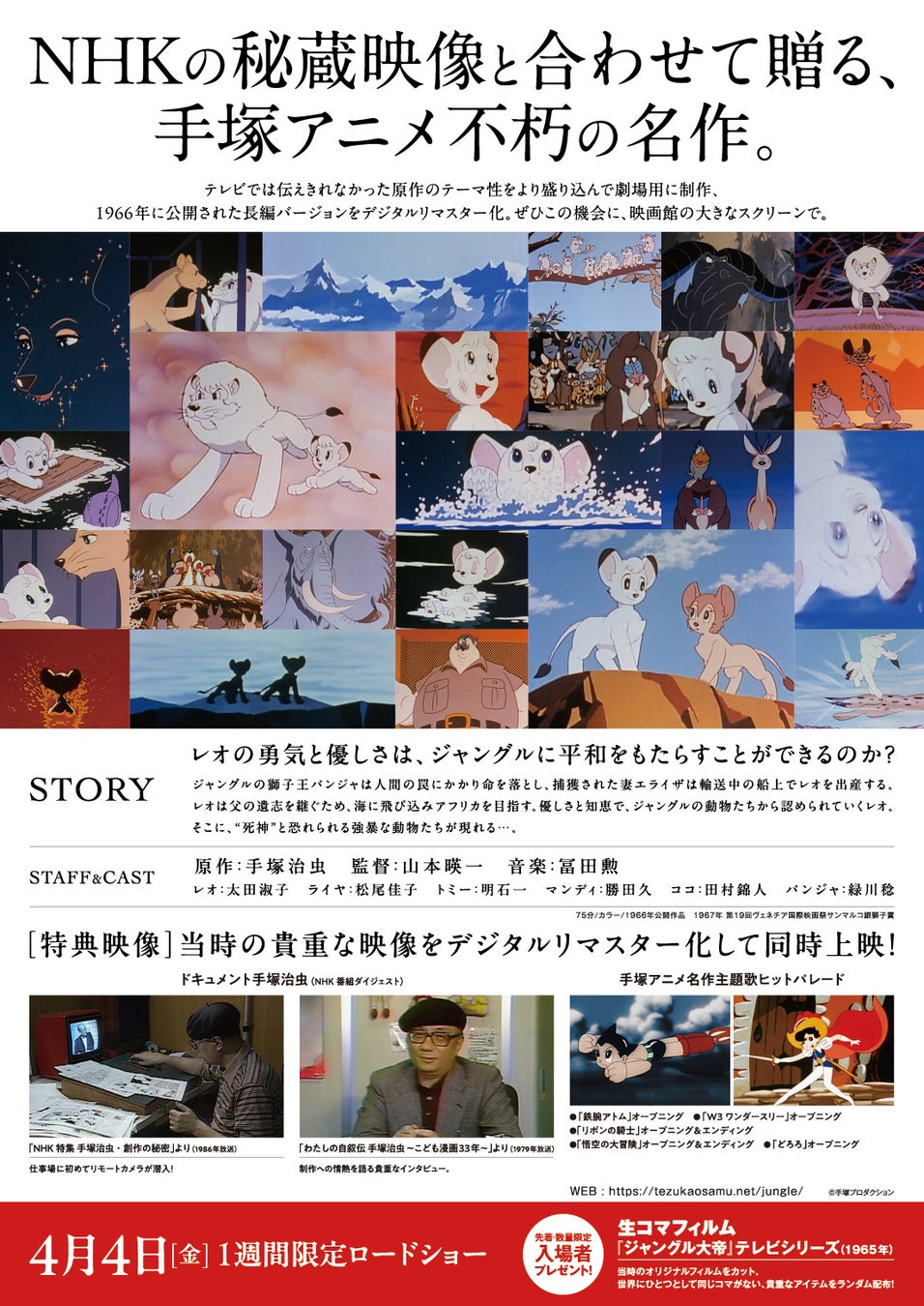 劇場公開決定に際し、本日解禁となったポスター・チラシは、1966年公開時のポスターを元にした昭和の当時の懐かしさを感じさせるもの。今なおその可愛さや魅力を放つ主人公レオの躍動する姿が印象的です。また、巨匠冨田勲による勇壮なテーマ曲も相まって期待が高まるPR動画も解禁となりました。