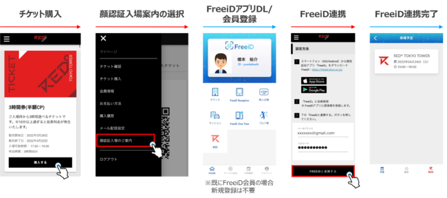 『RED゜TOKYO TOWER』のチケット購入サイト(https://tokyotower.red-brand.jp/tickets/)よりチケットを購入後、FreeiDのアプリで顔を登録し、チケットサイトの「FreeiDと連携する」ボタンを押せばFreeiDと連携が完了します。顔がチケットになるので、チケットやスマホを探す必要がなく手ぶらで入場ができます。