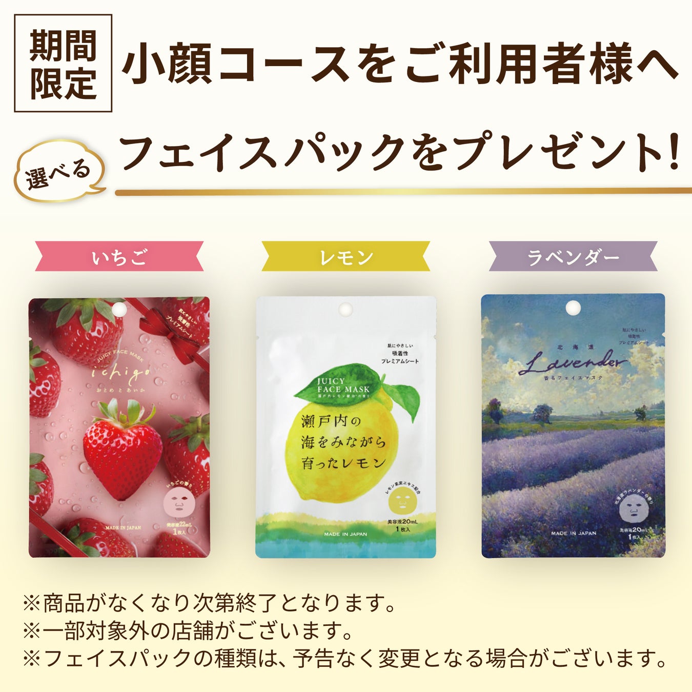 ※フェイスパックの種類は、予告なく変更となる場合がございます。