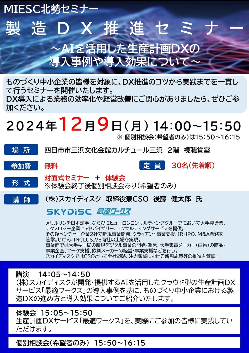 株式会社スカイディスク(本社:福岡県福岡市中央区、代表取締役CEO:内村 安里、以下「スカイディスク」)は、三重県産業支援センターが主催する「製造DX推進セミナー ~AIを活用した生産計画DXの導入事例や導入効果について~」にて県内の製造業向けDX推進セミナーに登壇いたします。このセミナーでは、DXを進める際に留意すべきポイントのご紹介や、DX推進の成功事例について講義します。さらには、ご参加頂いた皆様向けにDXツールの体験会として、AI搭載の生産計画DXサービス「最適ワークス」を見て頂く機会を提供いたします。