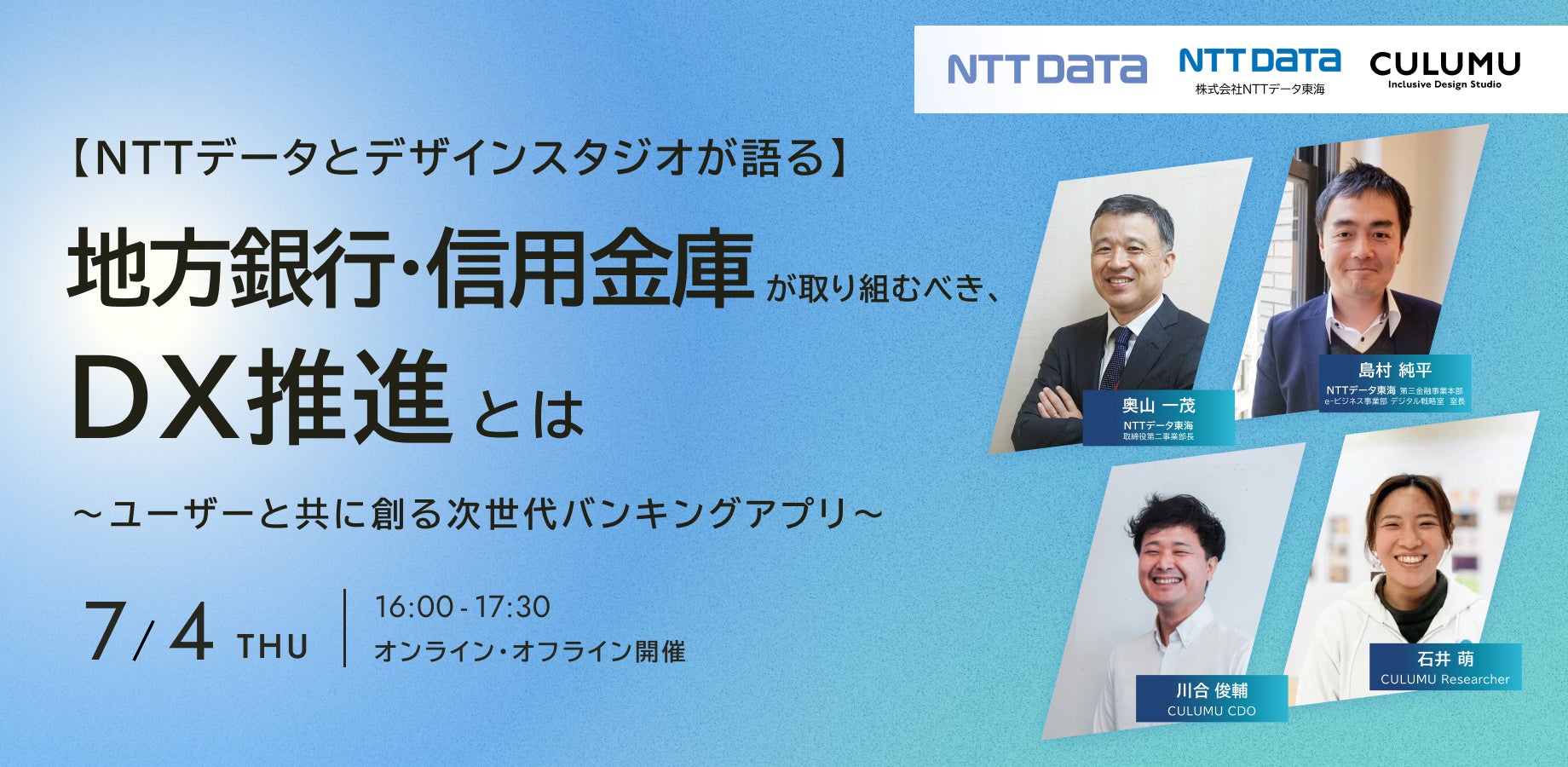 【NTTデータとデザインスタジオが語る】 地方銀行・信用金庫が取り組むべき、DX推進とは 〜ユーザーと共に創る次世代バンキングアプリ〜 セミナー開催:7/4(木)16:00-17:30