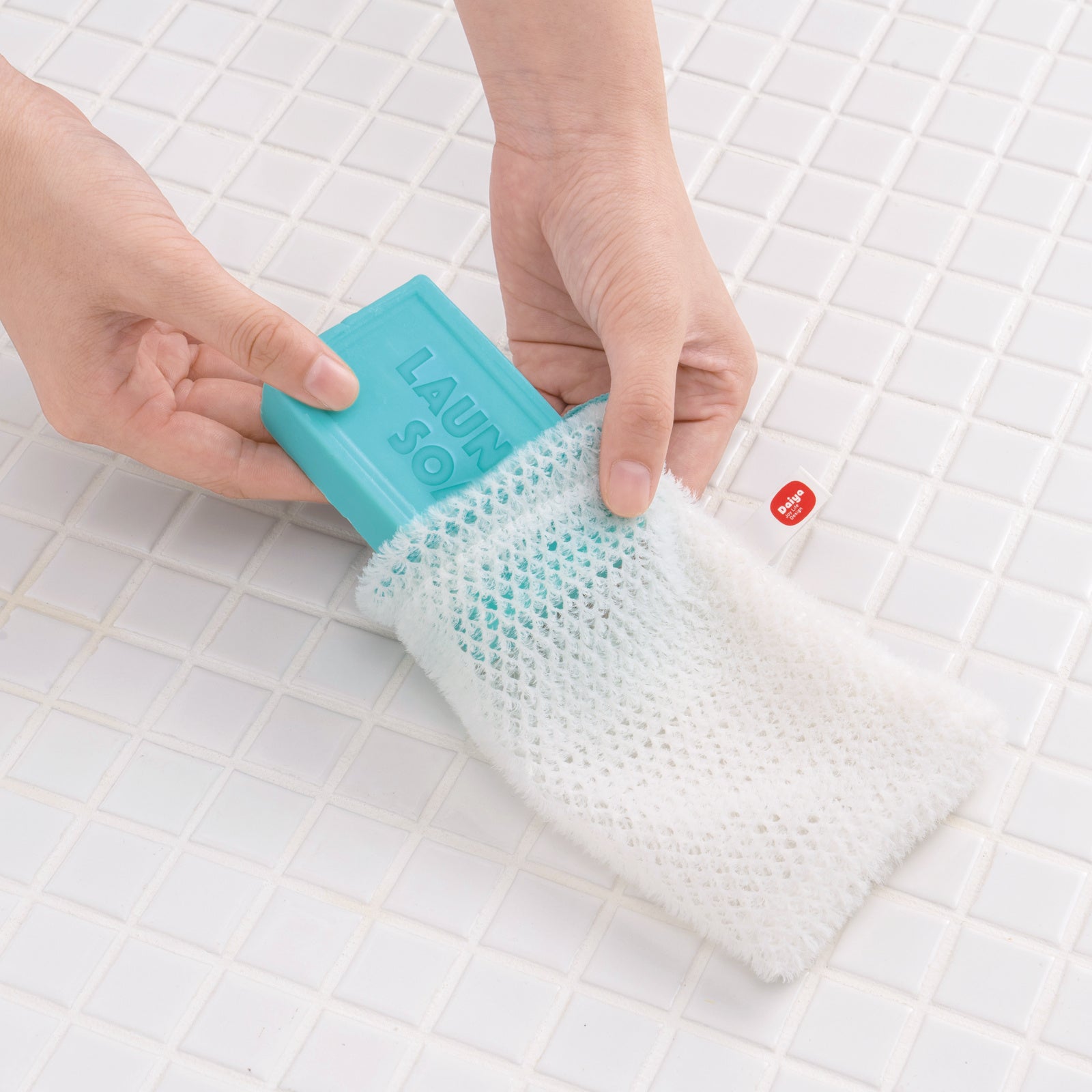 単体だと泡立ちにくい固形せっけんを入れてこすることで、洗濯機洗いだけでは落ちにくい頑固な汚れも落としやすくします。特殊なブラッシング生地を採用し、汚れをしっかりかき出します。