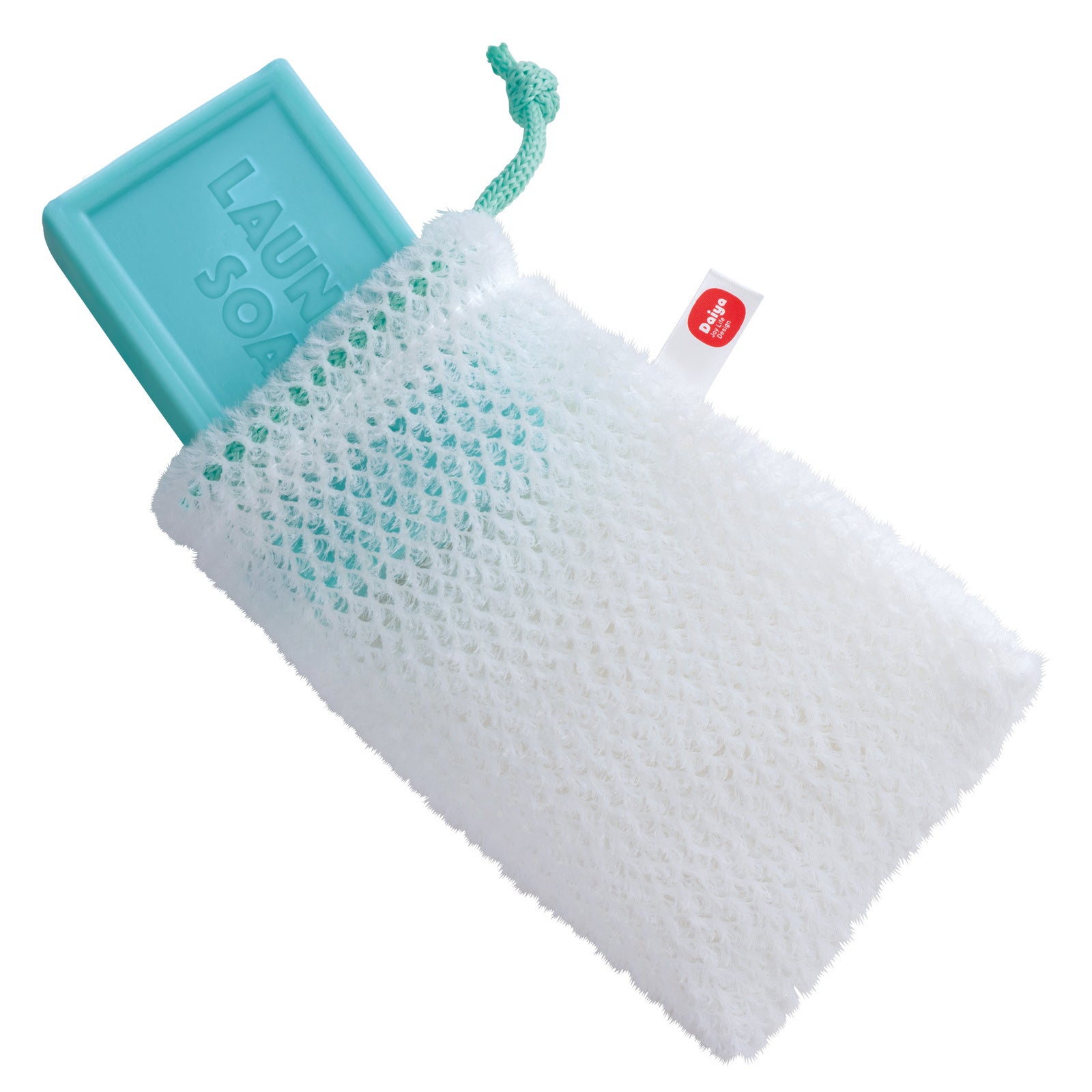 『洗濯せっけんネット』は、洗濯せっけんをすっぽり入れることができ、洗濯機洗いだけでは落ちにくいしつこい汚れの部分洗いに便利な洗濯せっけん専用のネットです。単体だと泡立ちにくい固形せっけんを入れるだけで、泡立ちやすく洗浄力を高めることができます。表面には極細ブラシが高密度に植毛されている特殊なブラッシング生地を採用し、頑固な汚れもしっかりかき出します。巾着ポケットタイプなので、せっけんが小さくなっても最後まで使い切りやすくなっています。また、使用後の洗濯せっけんは水を含んだまま置いておくと溶けてしまいますが、巾着の紐をフックに掛けて乾燥させることで溶けにくく、収納にも困りません。