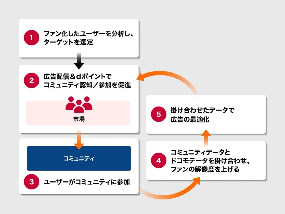 クオンの既存クライアント2社にご賛同いただき、それぞれのコミュニティの活性化とファンの解像度向上に向けた施策を実施しました。「dポイント」をインセンティブとしたキャンペーンをコミュニティで実施し、あわせて、ドコモの広告配信ソリューションを活用することで、新規ユーザーの獲得や既存ユーザーの活性化に取り組みました。これにより、ブランドのファンだがコミュニティの存在を知らないユーザーや、ブランドのライトファン(ファン予備軍)のコミュニティ参加が確認でき、1社では、過去最多の新規登録者を記録しました。