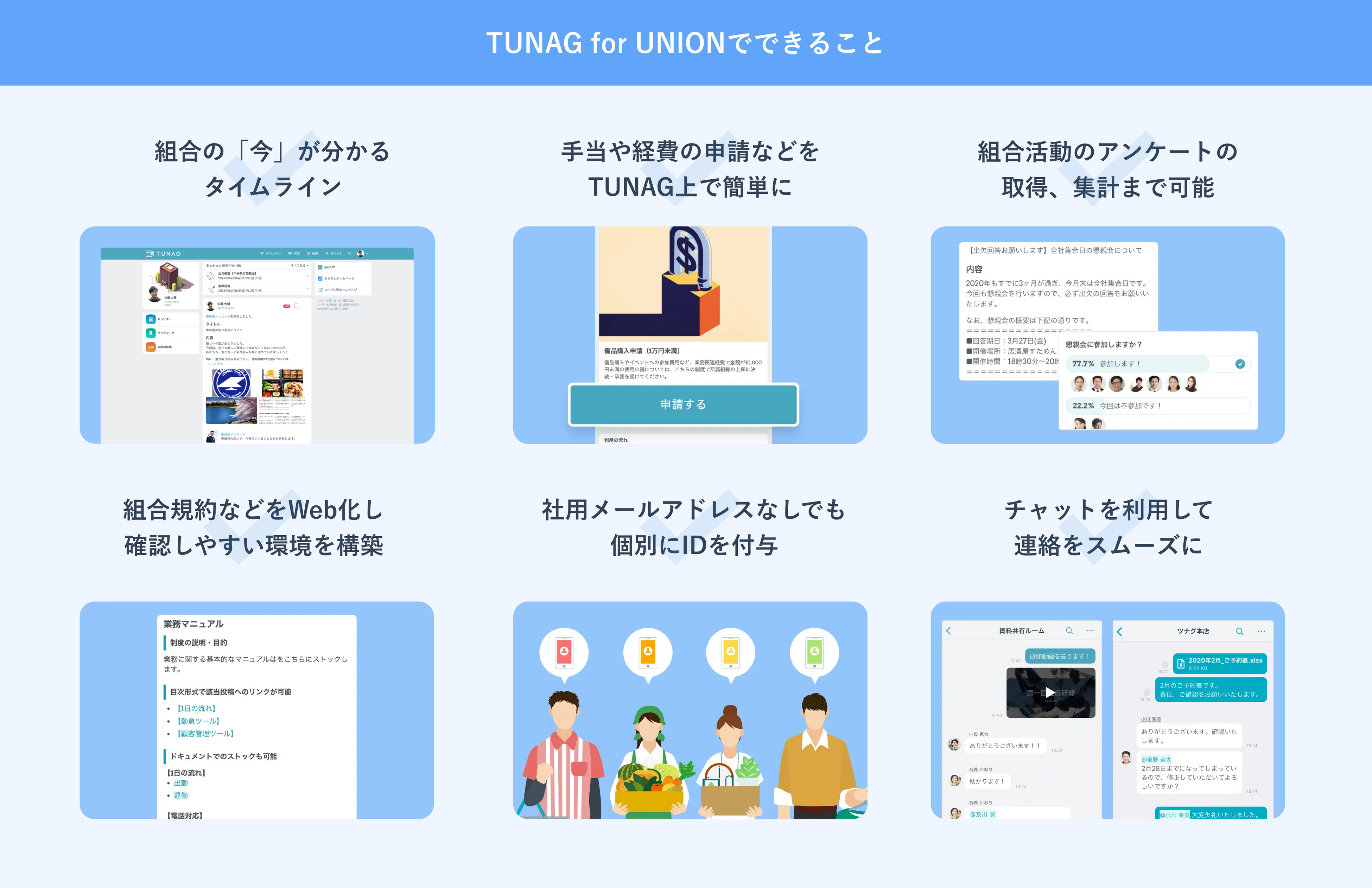 当社は、TUNAG for UNIONを通じて、組合活動や組合員といった「労働組合」を形作る全ての要素をつなぐことで、労働組合に関わる皆様と一緒に新しい未来を創り上げ、組合員の幸せを実現してまいります。