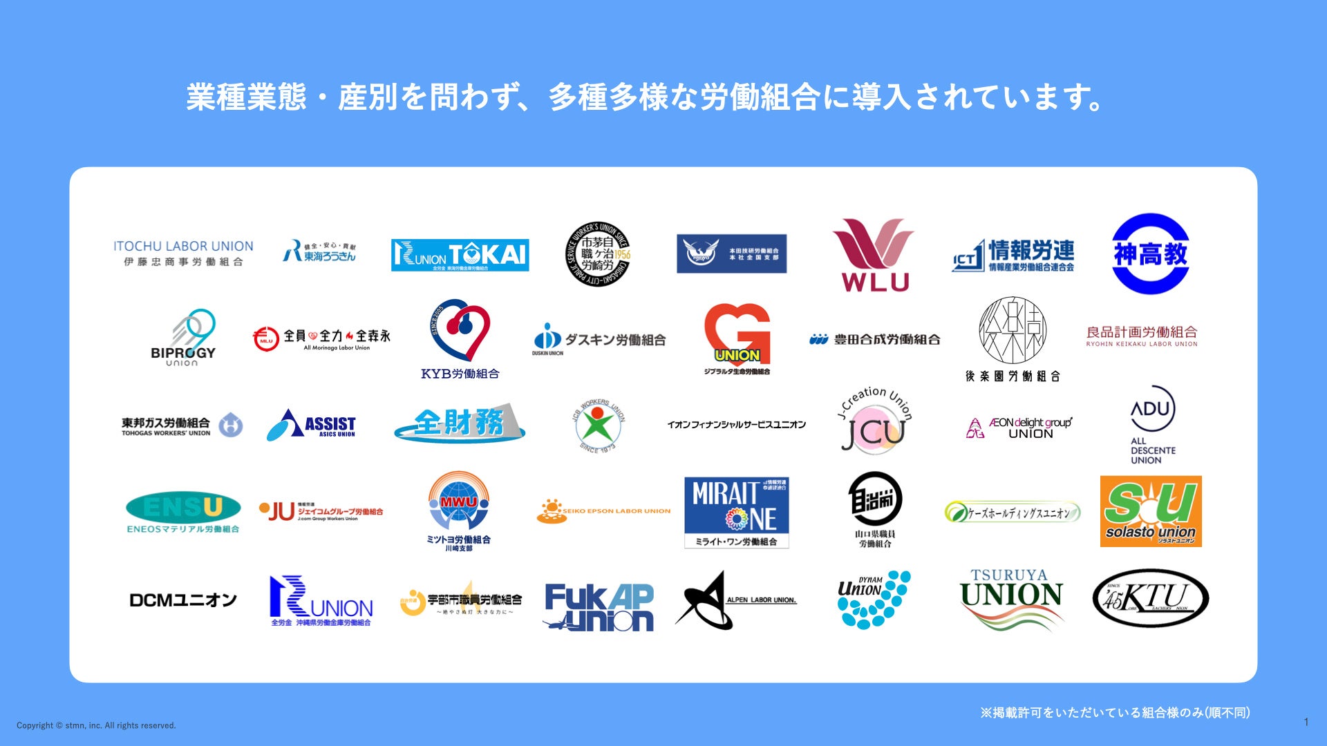 上記の貢献価値が評価され、TUNAG for UNIONは業種業態・産別を問わず、多種多様な労働組合に導入されています。