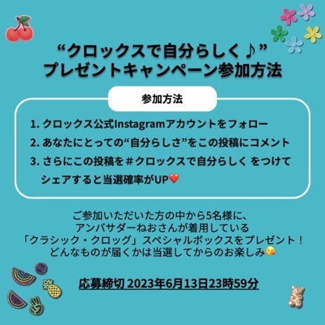 革新的なカジュアルフットウェアのグローバルリーダーであるクロックスは、この度アンバサダーのねおさんが、“クロックスで自分らしく”キャンペーンで着用したモデルとほぼ同じモデルのクラシック クロッグとジビッツ™チャームの組み合わせを施したシューズを抽選でプレゼントするキャンペーンを実施いたします。このキャンペーンは消費者の皆様にクロックスのブランドテーマであるCome As You Are™の意味をお伝えし、皆様それぞれの自分らしさを応援するものです。クロックスのソーシャルアカウントにコメントをすることで、5人の当選者の方がアンバサダーのねおさんがセレクトし、パーソナライズされたクラシック クロッグとジビッツ™チャームのスペシャルボックスを手に入れることができます。