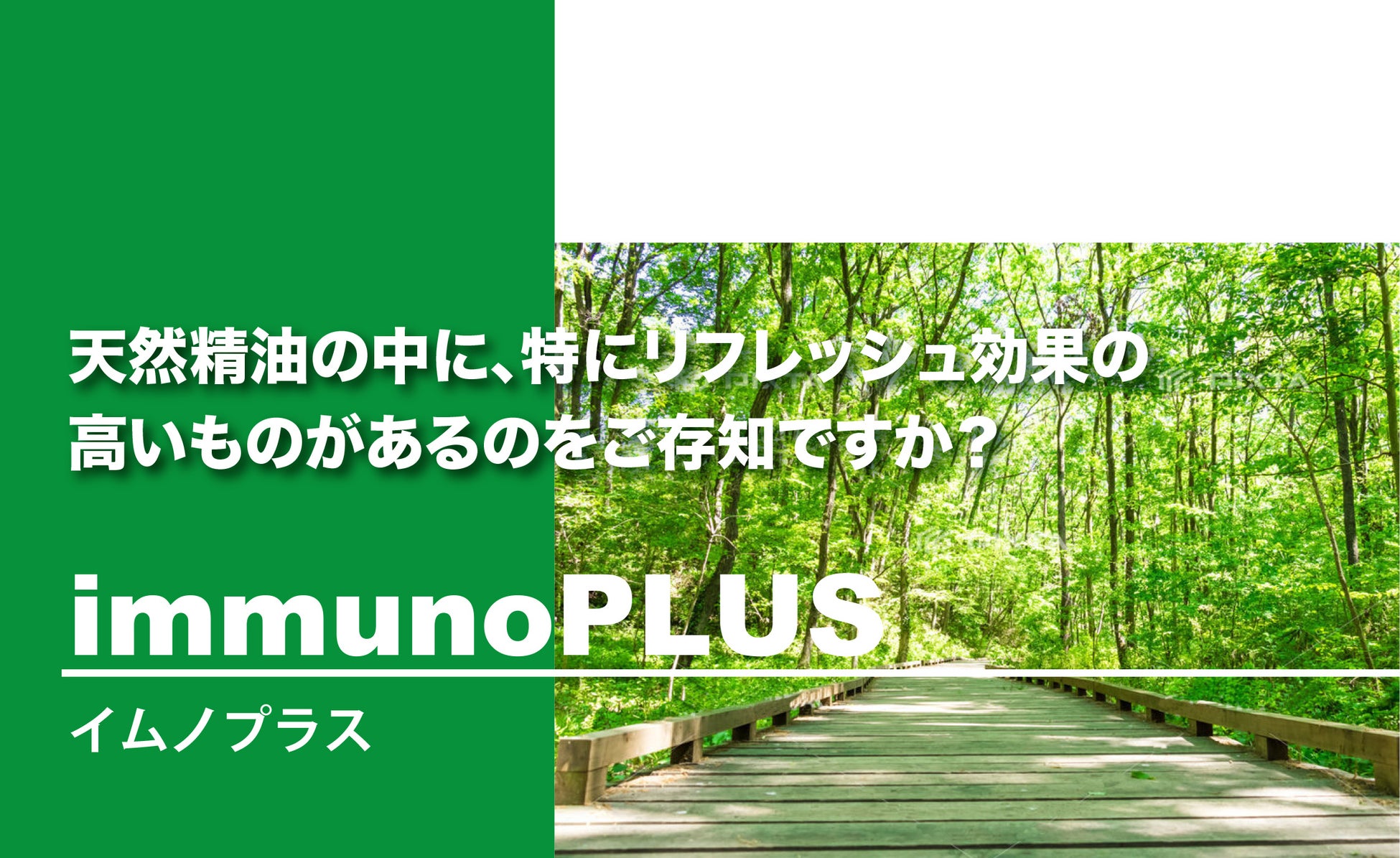 中でも「immunoPLUS」は、ベルガモットとヒノキ、ペパーミントなどリフレッシュ効果の高い数種類の天然精油をブレンドしており、オフィスやクリニックなど様々な空間で流すことで森林浴をしているかのようなリフレッシュ効果やリラックス効果を感じていただける、まさに「どこでも森林浴」できる香りです。