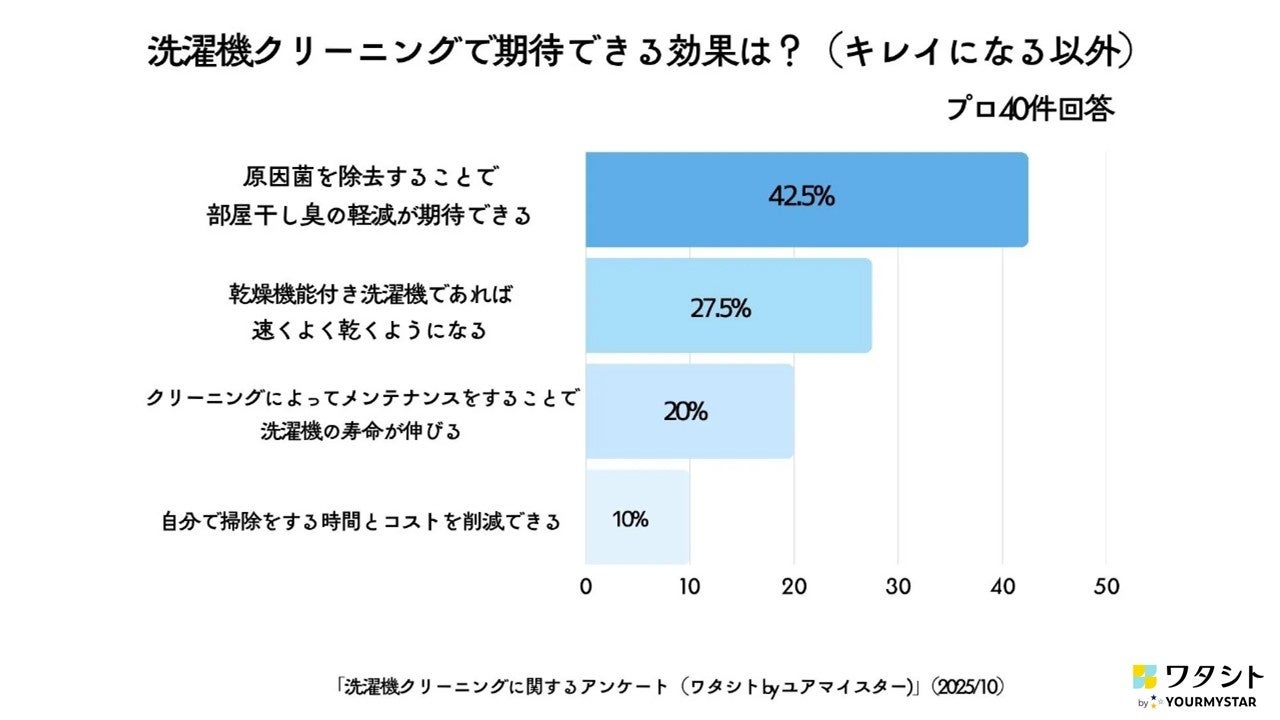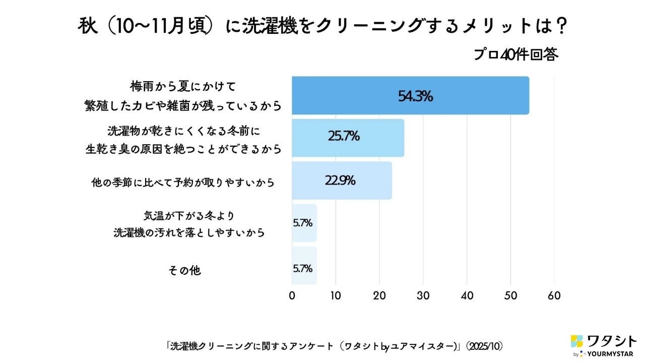 こうした汚れをリセットするには、気温や湿度が落ち着き、乾燥しやすい秋のタイミングが理想的です。そこでユアマイスターでは、ハウスクリーニングのプロが考える「秋の洗濯機クリーニングのメリット」や「クリーニングによる効果」について、ハウスクリーニング事業者40名にアンケート調査を行いました。