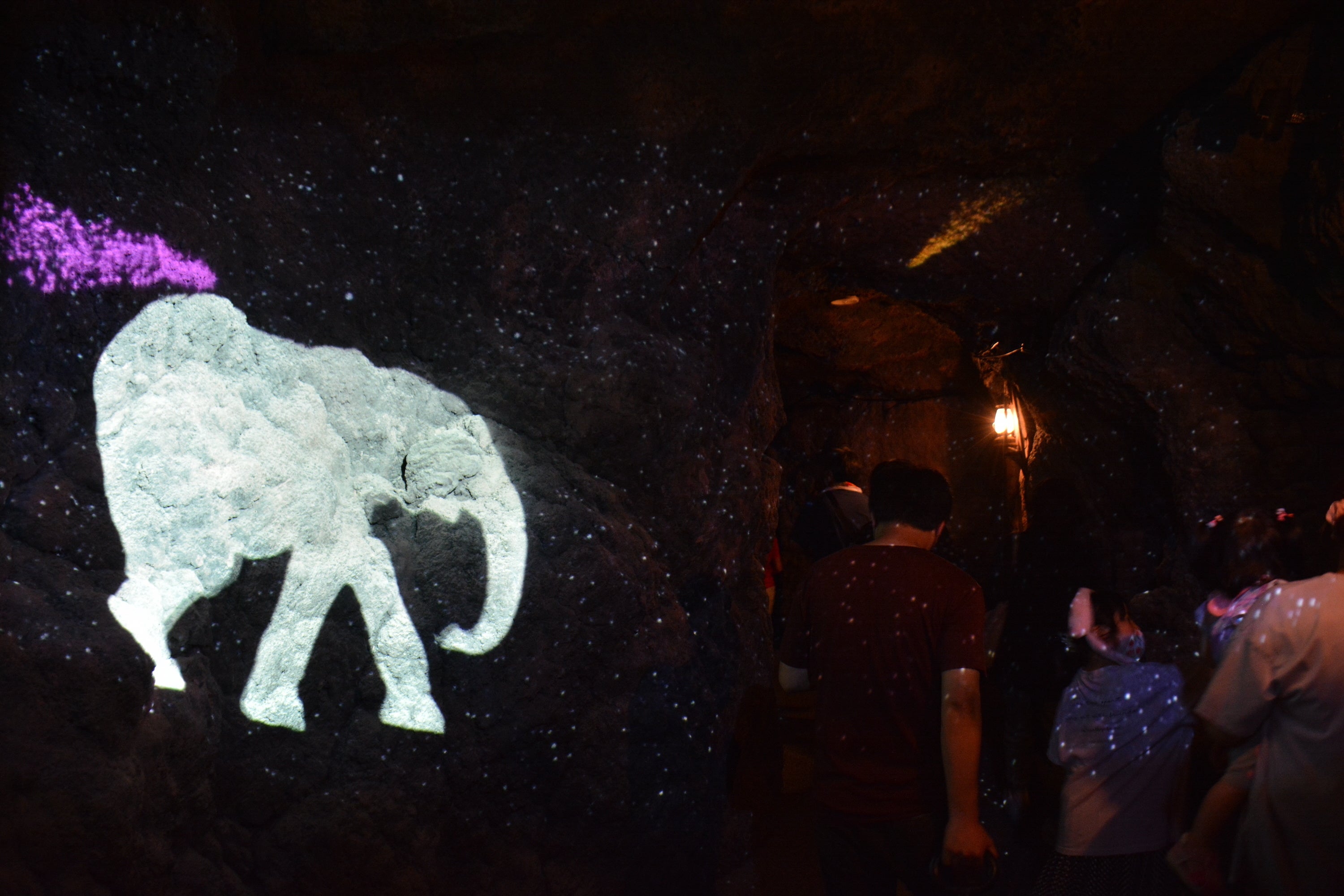 植物園に入り、ゾウやペンギンのシルエットに誘われるように歩を進めると、ピンクや青、赤などのライトに照らされた熱帯のジャングルが姿を現します。壮大な音楽が流れる中で、ガジュマルやパパイヤ、バナナ、さらに夜になると甘い香りがするキダチチョウセンアサガオなどがライトアップされ、幻想的な光景が広がっていました。